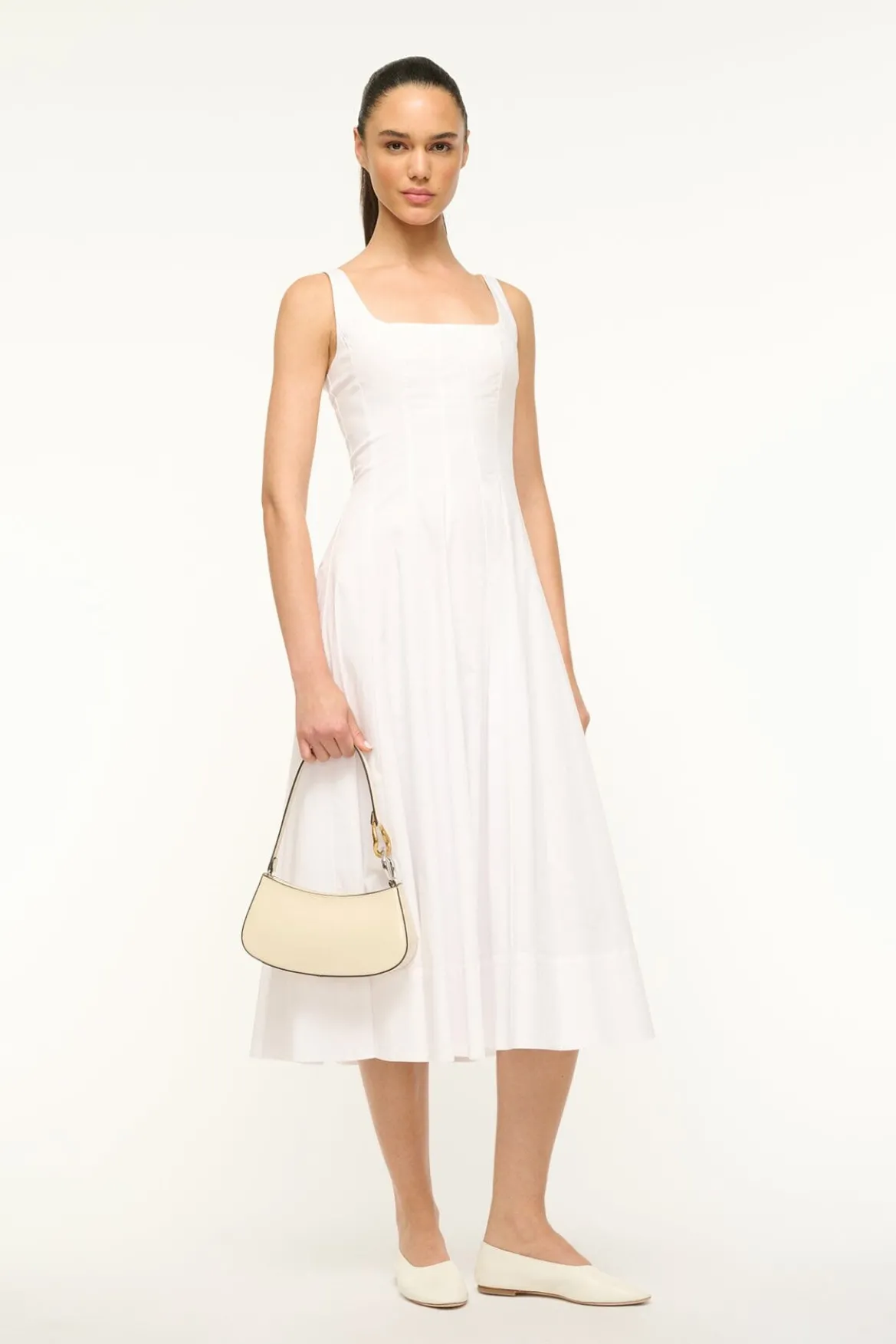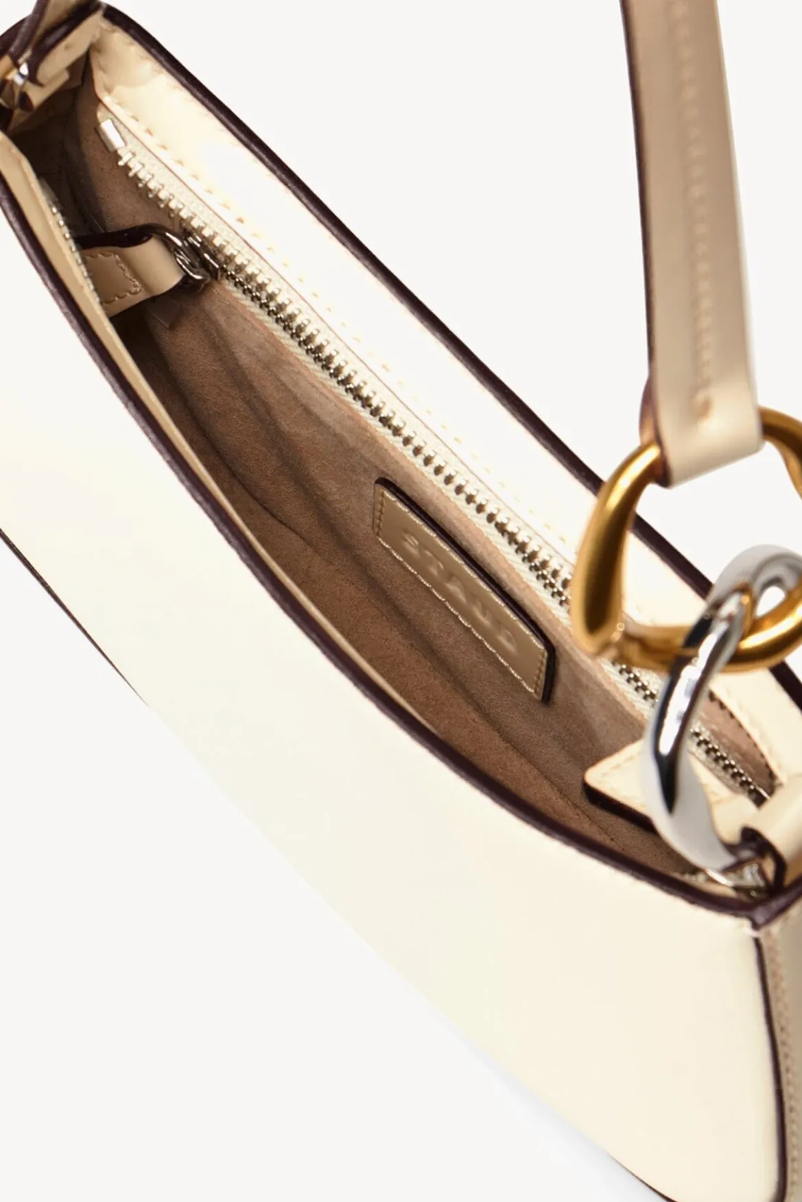The Ollie Bag is a mini shoulder bag made out of polished leather. This style features a hardware design on the strap and a zip closure.