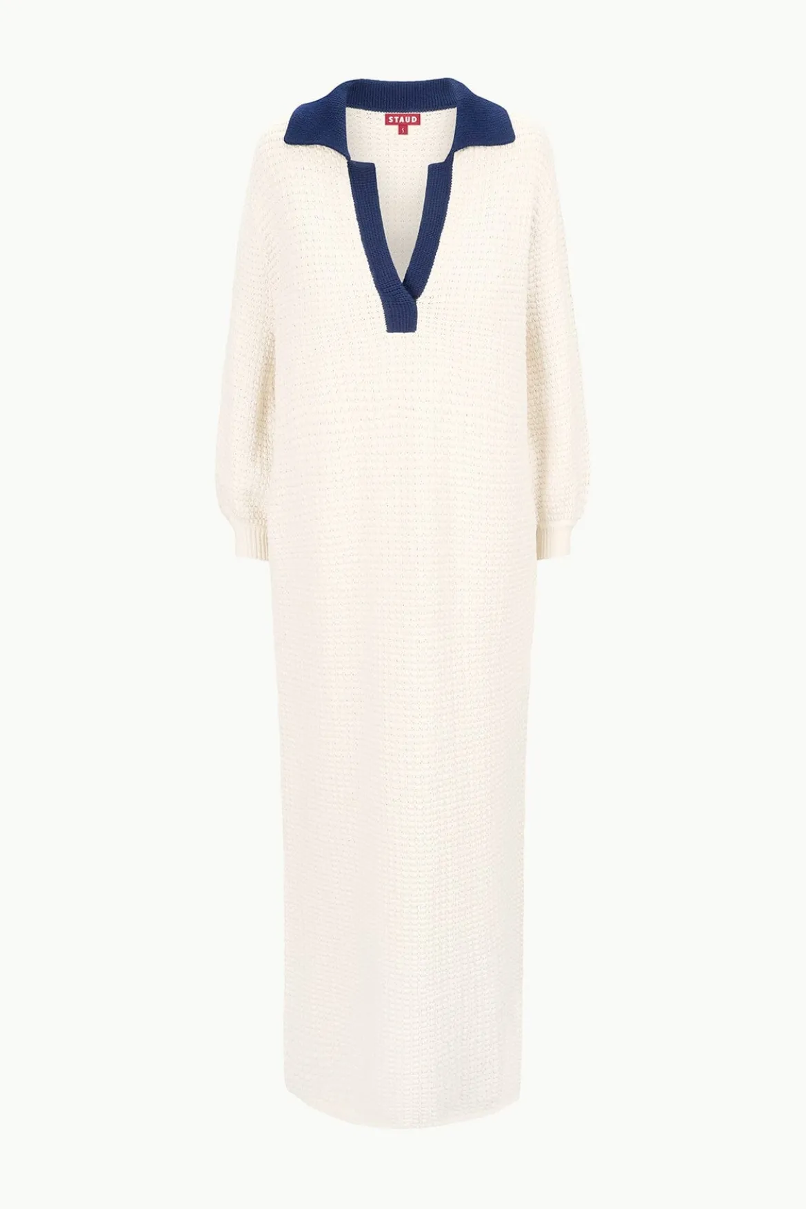 A cozy transitional piece, the Altea Dress is made out of a chunky cotton waffle knit fabric. This style features a long sleeve and a contrasting polo collar.