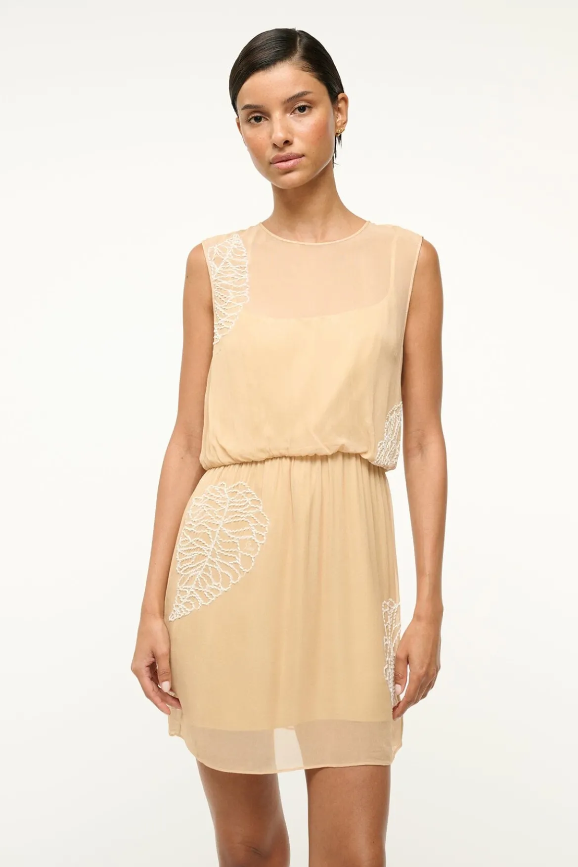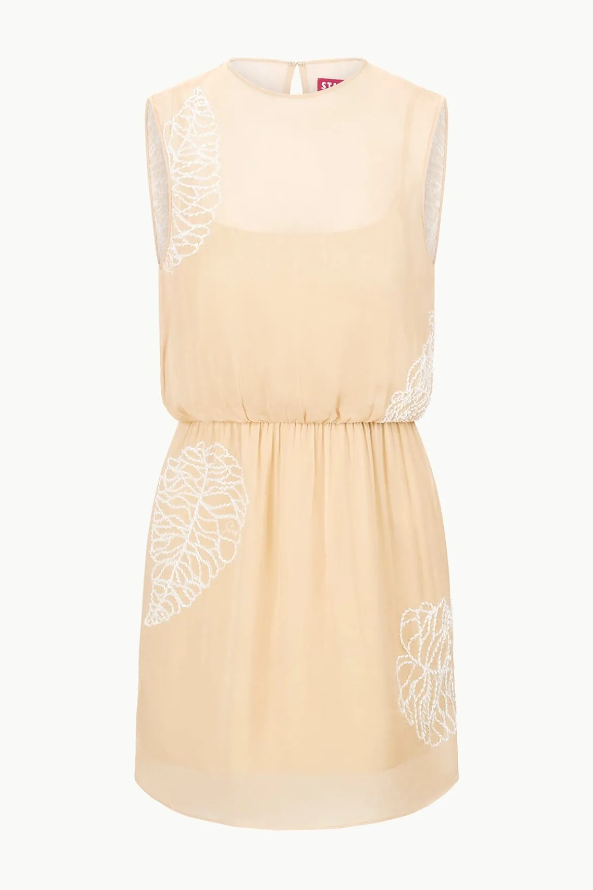 A sleeveless shift mini dress made crafted from a beaded chiffon fabric. The Amelie Dress features hand-beaded 3D palm leaf applique and a gathered waist.