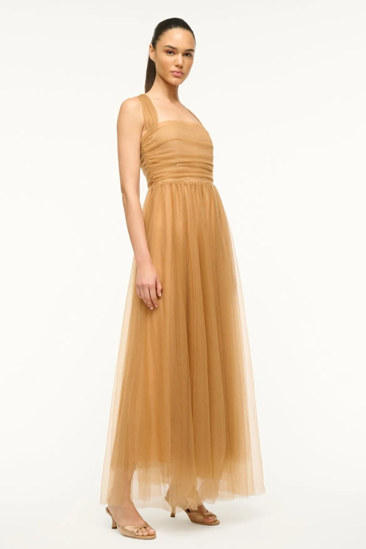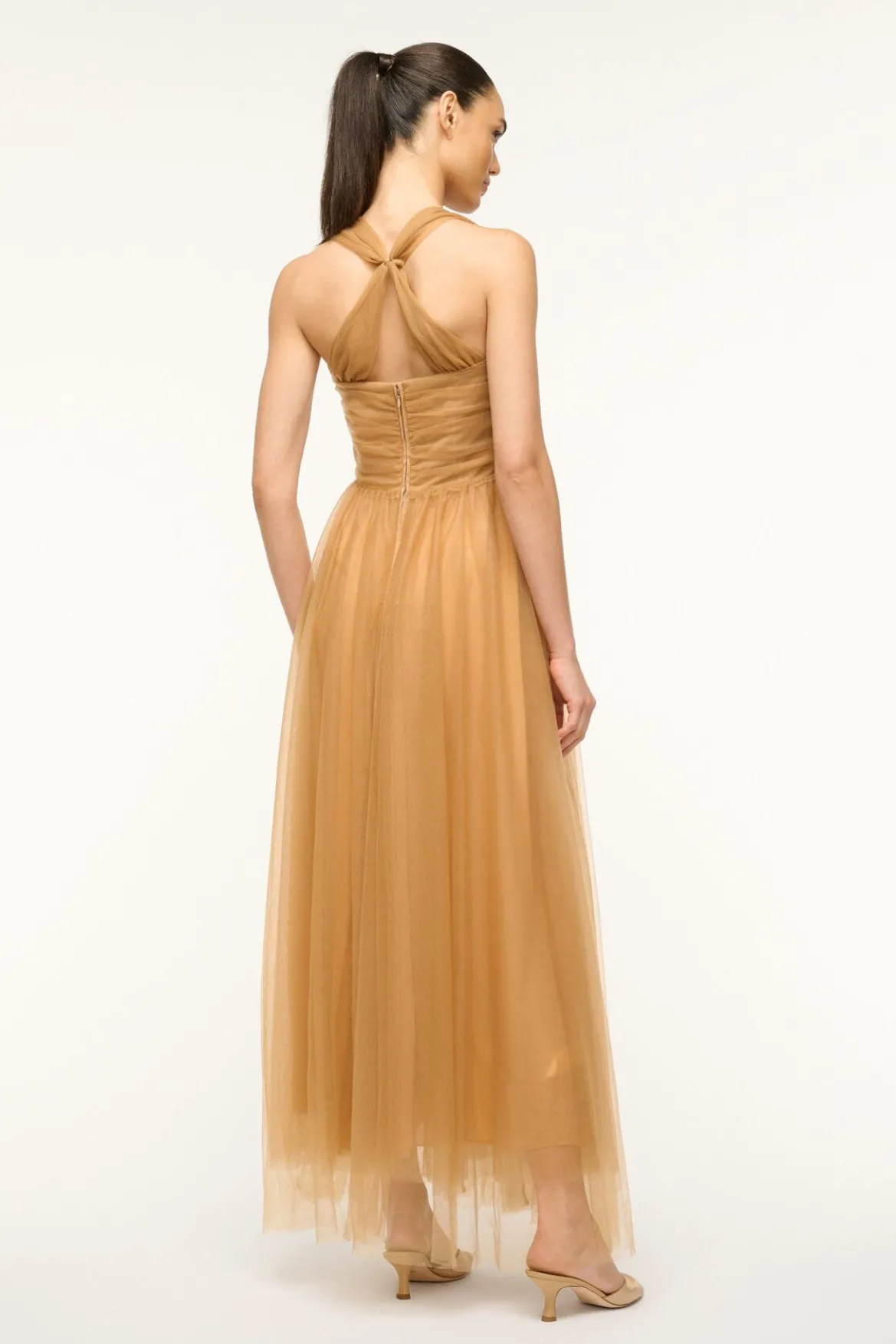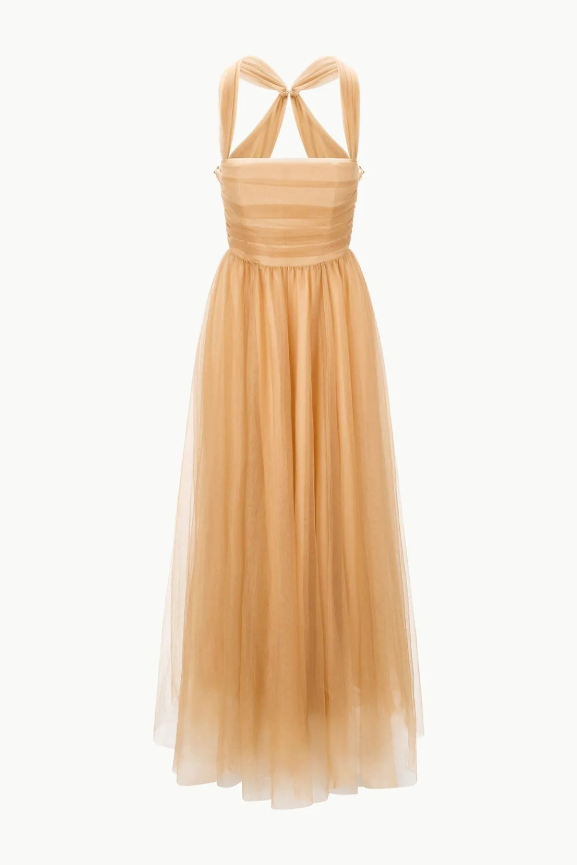 A halterneck gown made from a dreamy draped tulle, the Antonia features a bustier-inspired bodice with interior corsetting and layered tulle skirt.