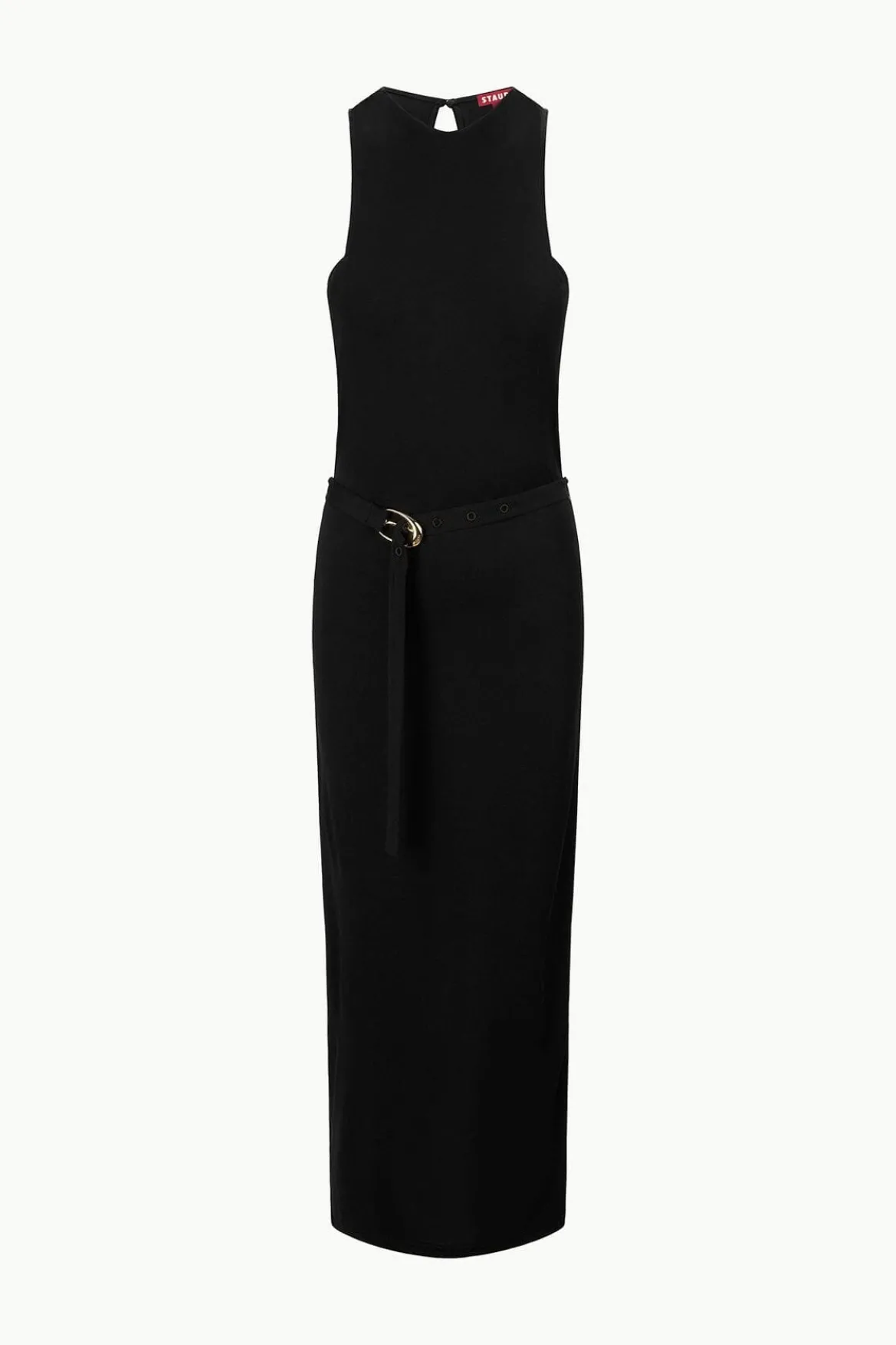The Brandy is a maxi length dress with a high neckline and waist belt featuring our signature moon buckle hardware.