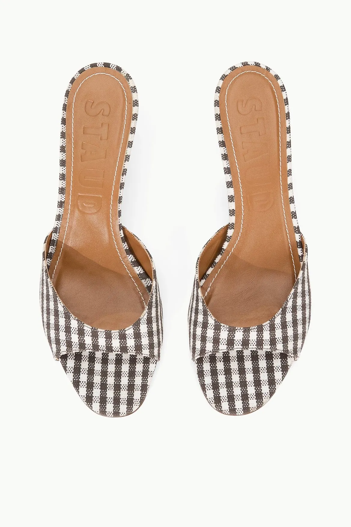 An open-toe mule featuring a gingham cotton canvas upper, the Brigitte is an essential kitten heel for versatile dressing.