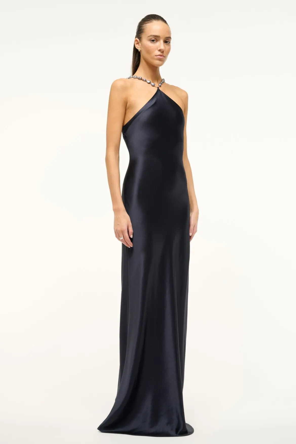 The Cadence is a floor length slip dress featuring a halter neckline with beaded pearl straps. This dress is crafted in satin and has a hidden back zipper.