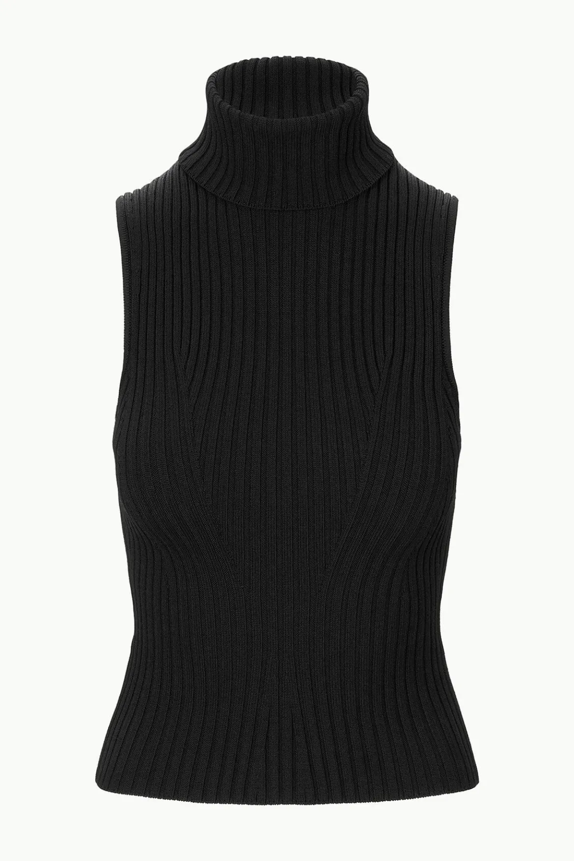 A sleeveless turtleneck top made out of a stretchy rib knit fabric. This style offers a fitted silhouette and full fashioning pattern throughout.