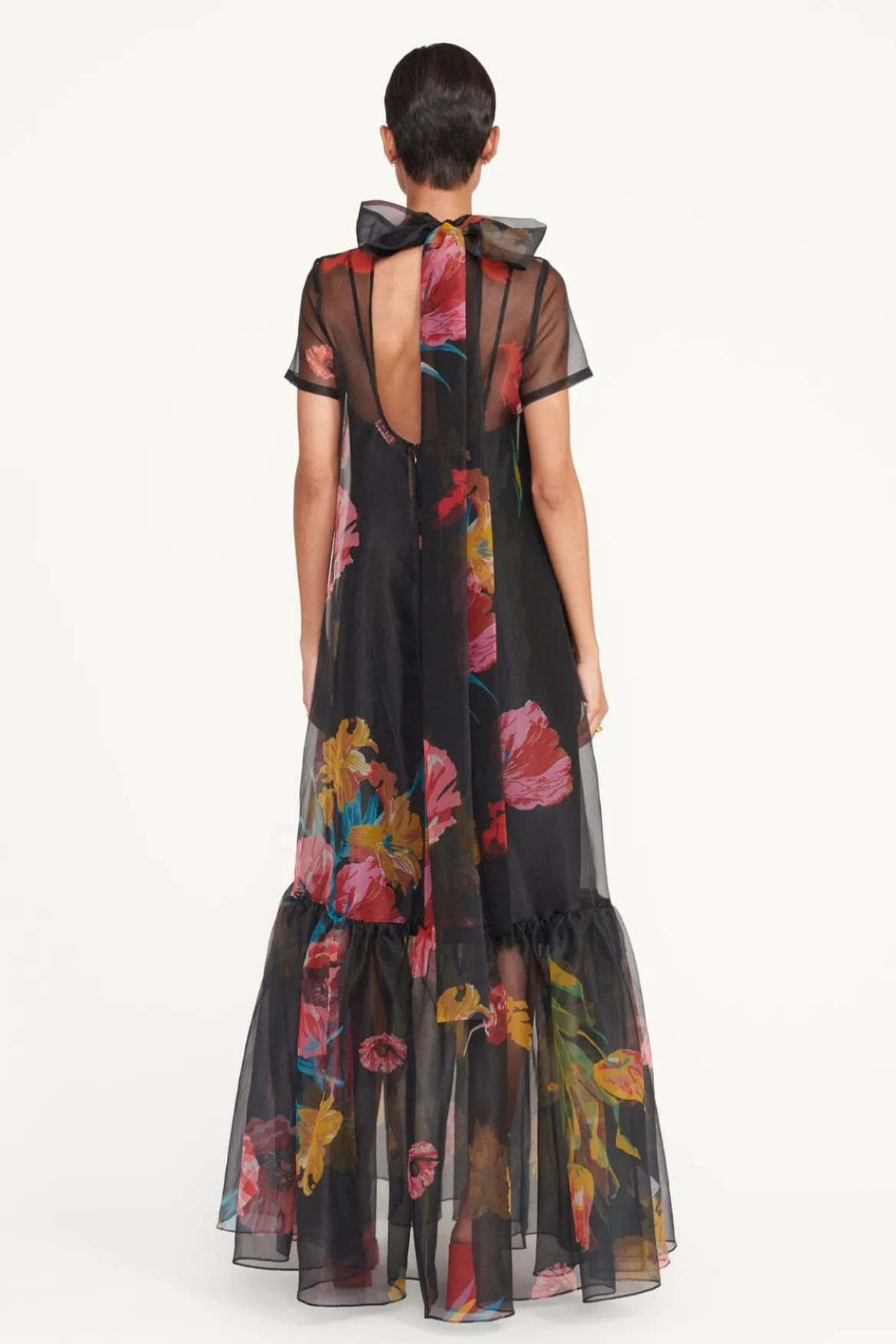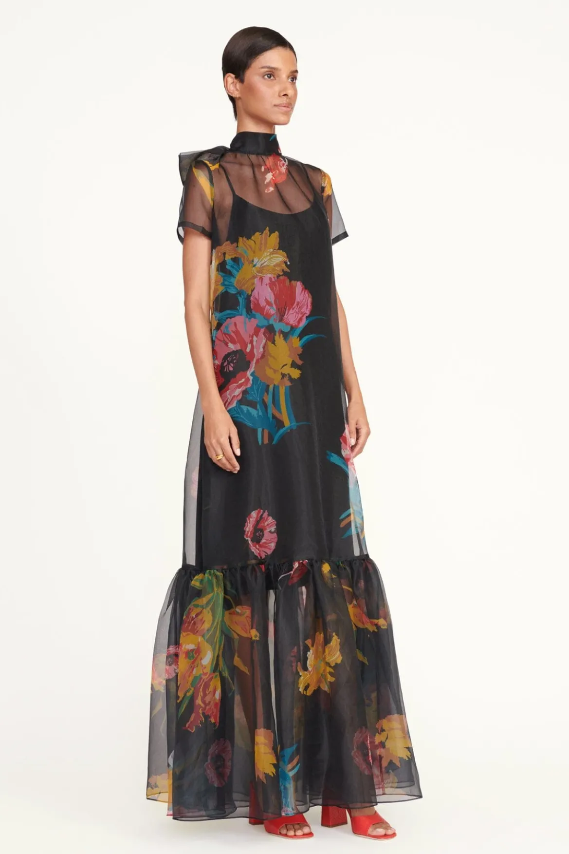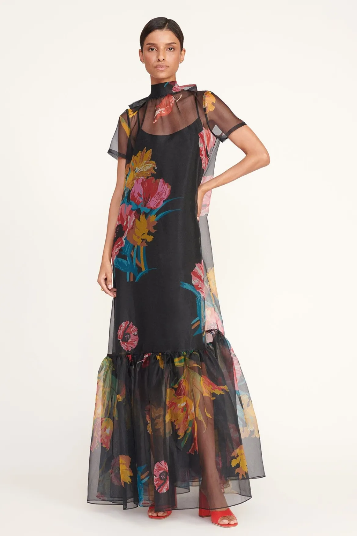 The Calluna Dress is a high neck organza gown with scoop back and functional neck tie. This style features a tiered ruffle hem and a midi slip.