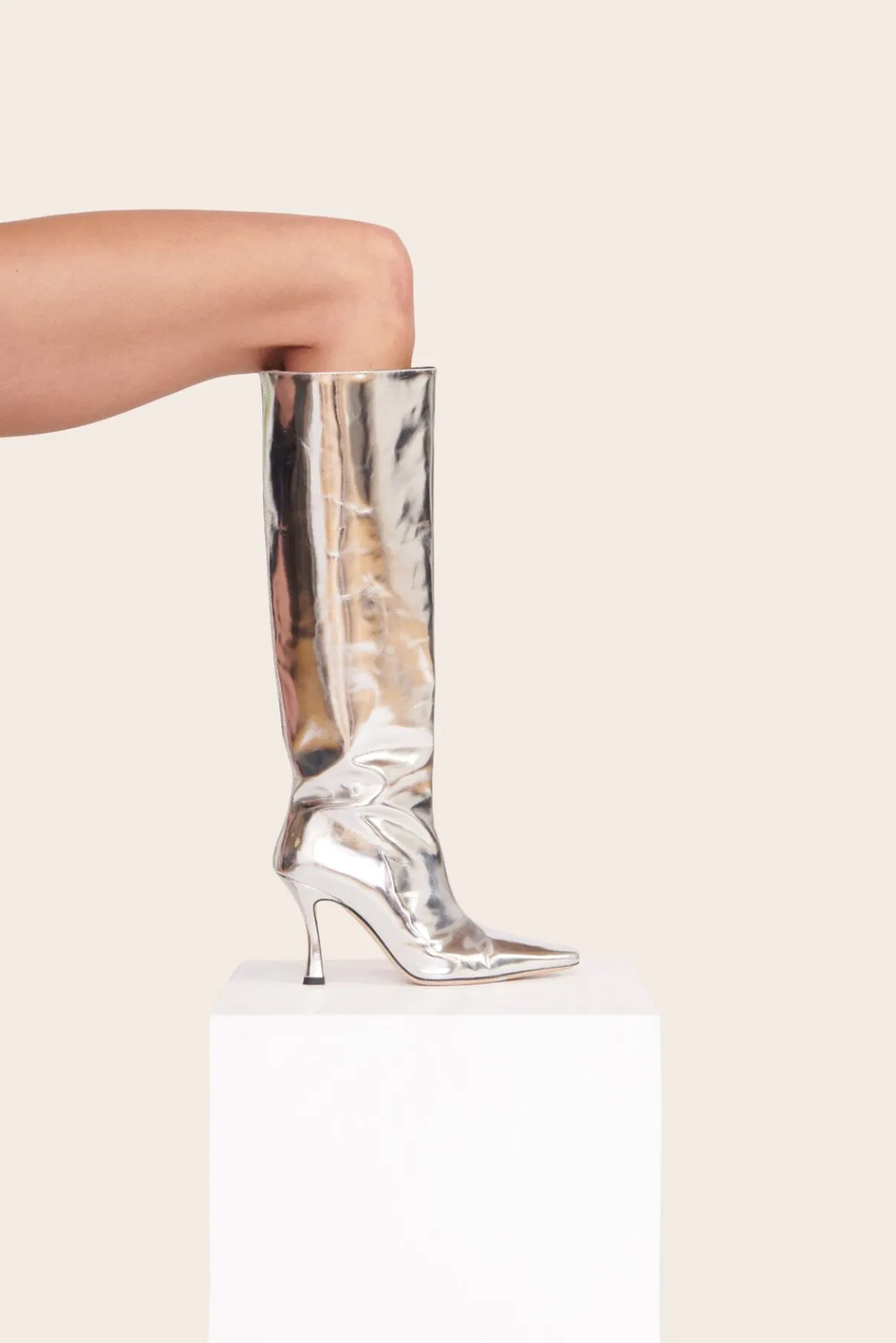 Our statement boot for the season. An updated high heel boot in a bold mirrored chrome leather. The Cami can be dressed up for night or worn casually during daytime.