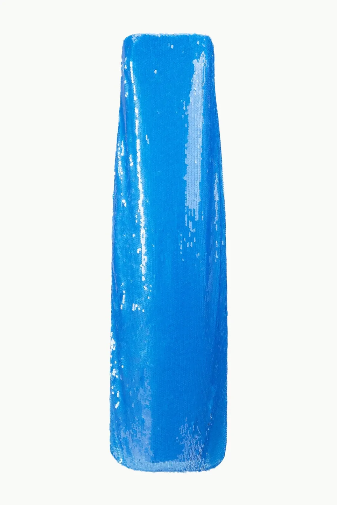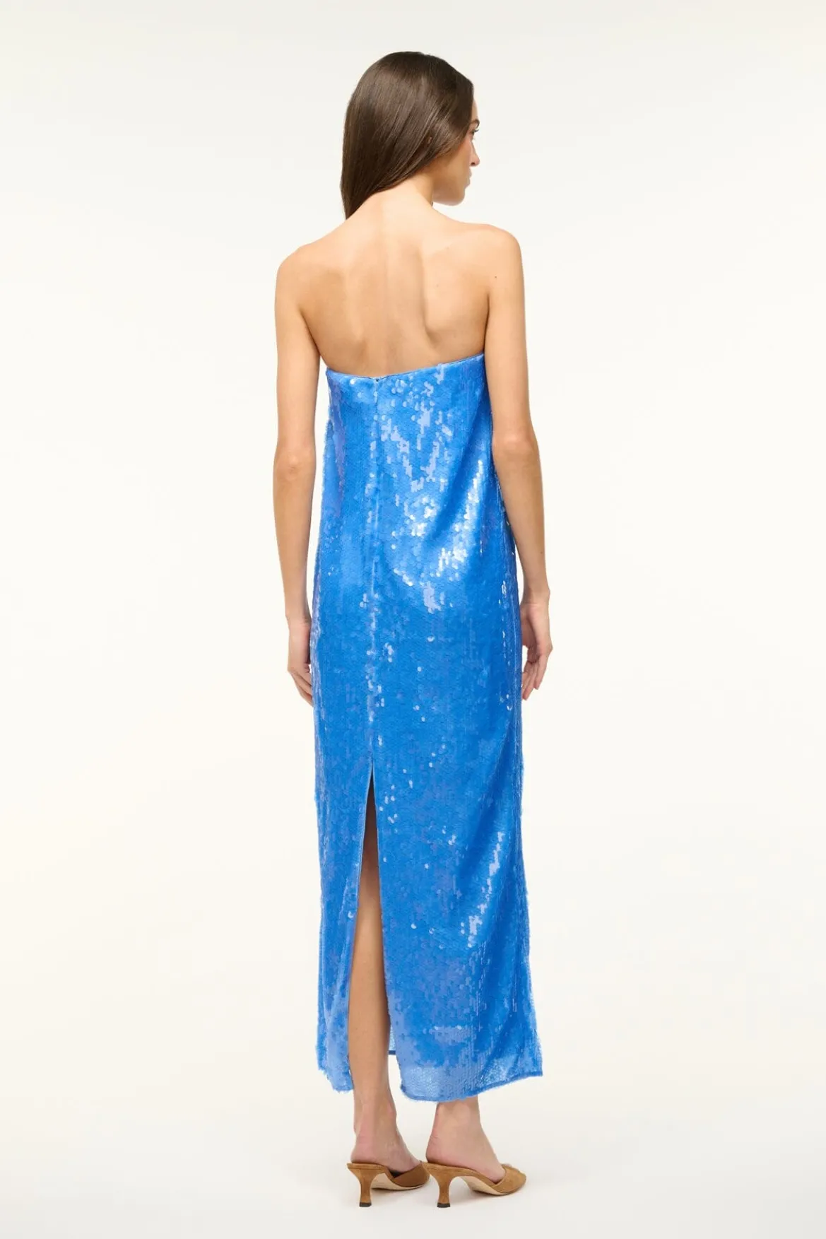 Our best-selling Casey Dress has been reimagined for the season; crafted in shiny sequins, this strapless gown features a relaxed silhouette throughout the body, a back slit, and a hidden zipper.