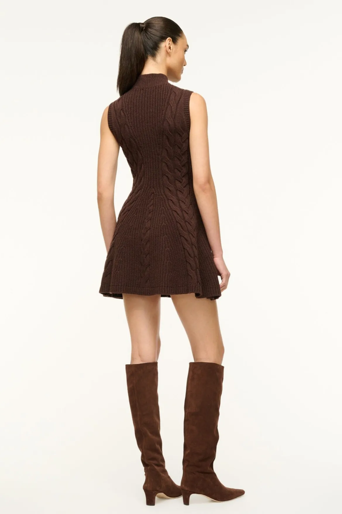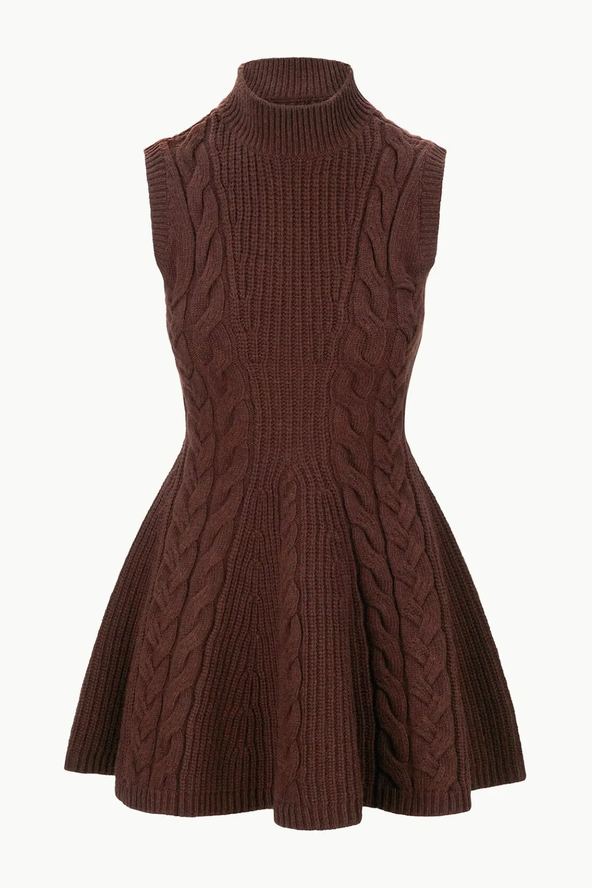 The Charade Dress is a mini length cable knit dress with a mock neck and full skirt.