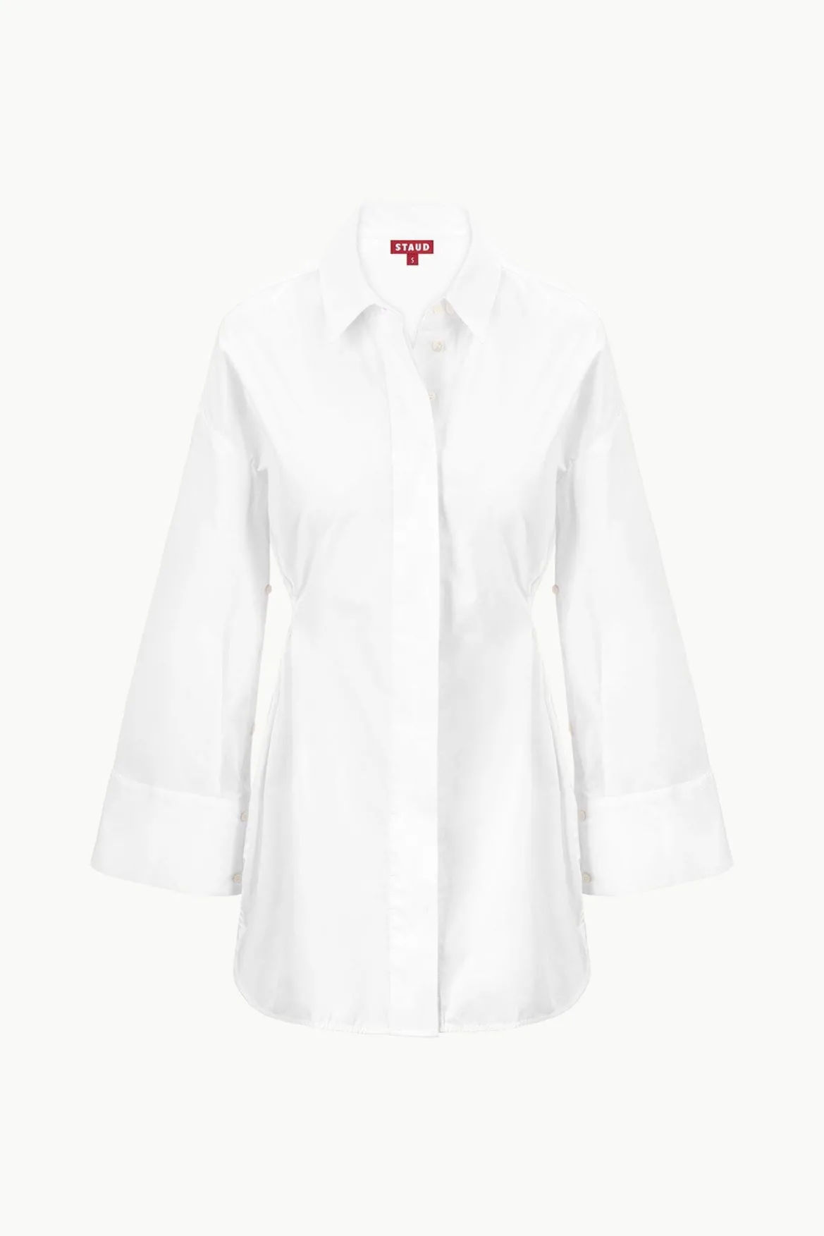 The Cindy is a mini shirtdress with pintucks at the waist, wide cuffs and a shirttail hem. This style is crafted from our signature cotton poplin fabric.