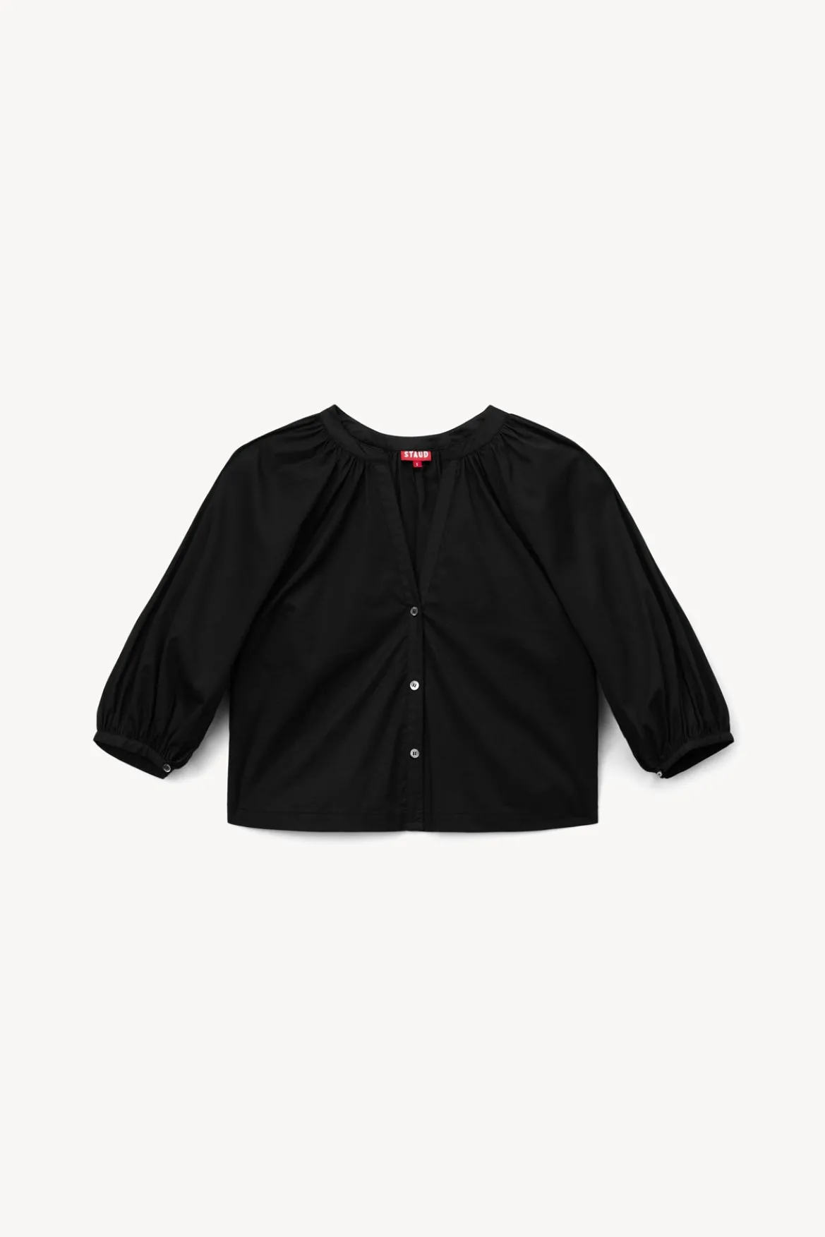The Dill Top is a cotton poplin button-down with 3/4 puffed sleeves. This classic top can be worn year-round.