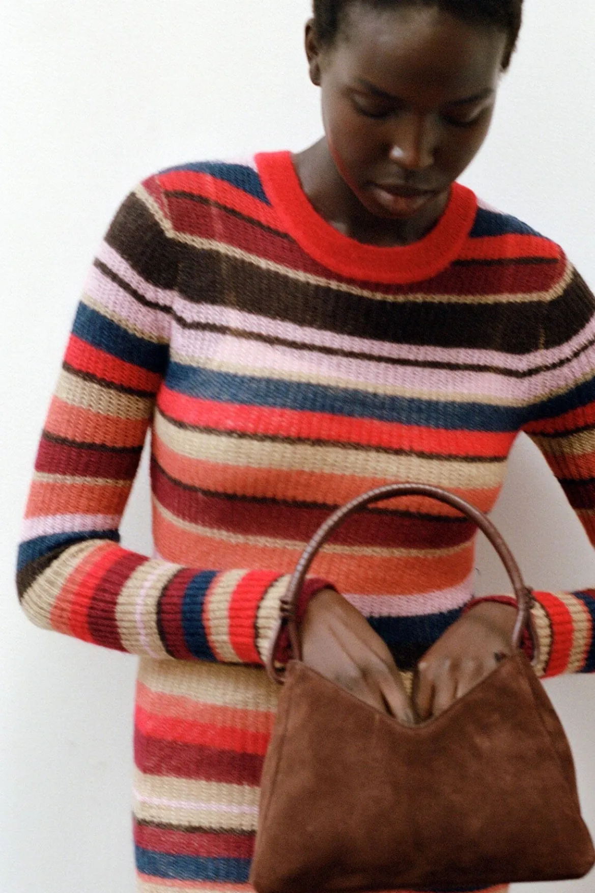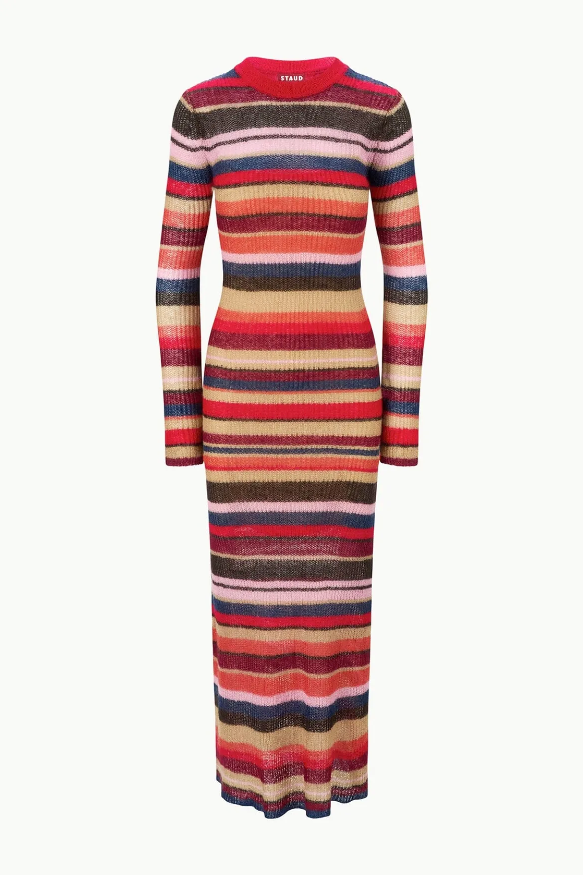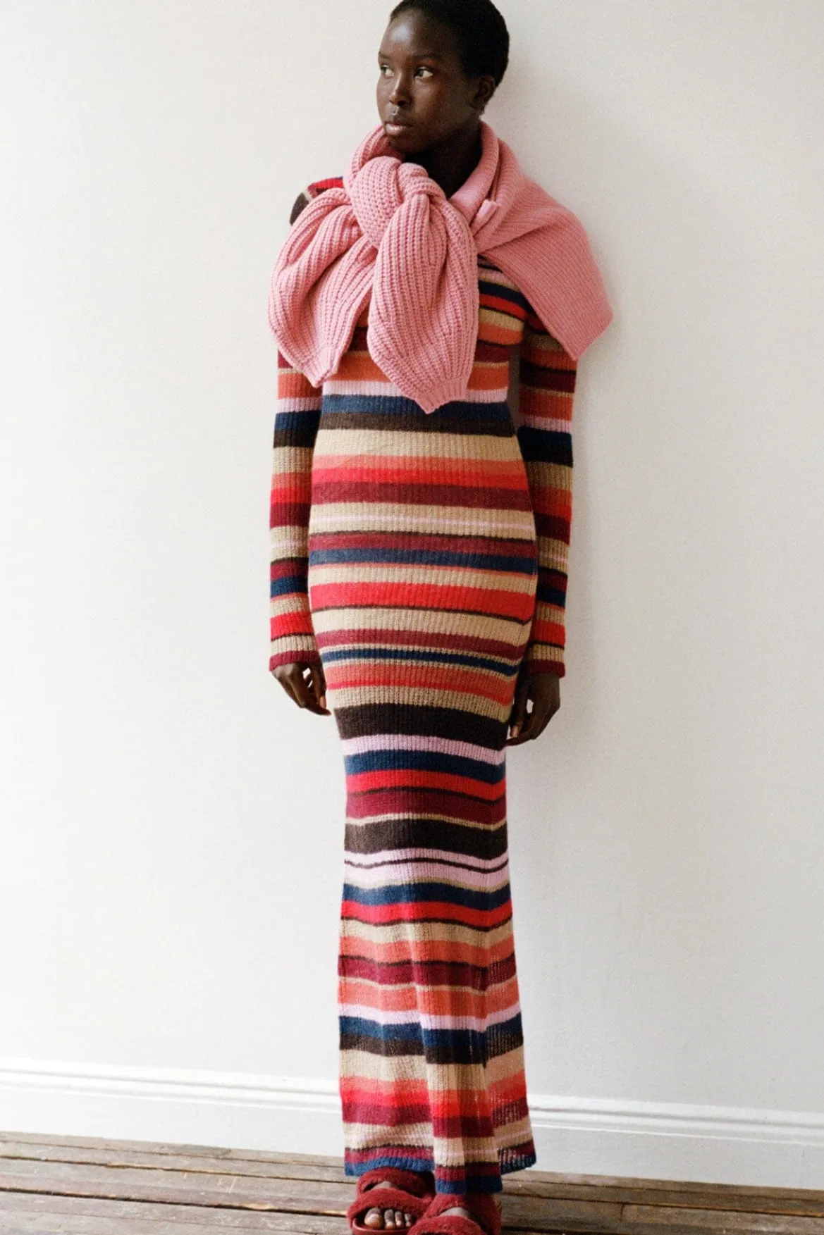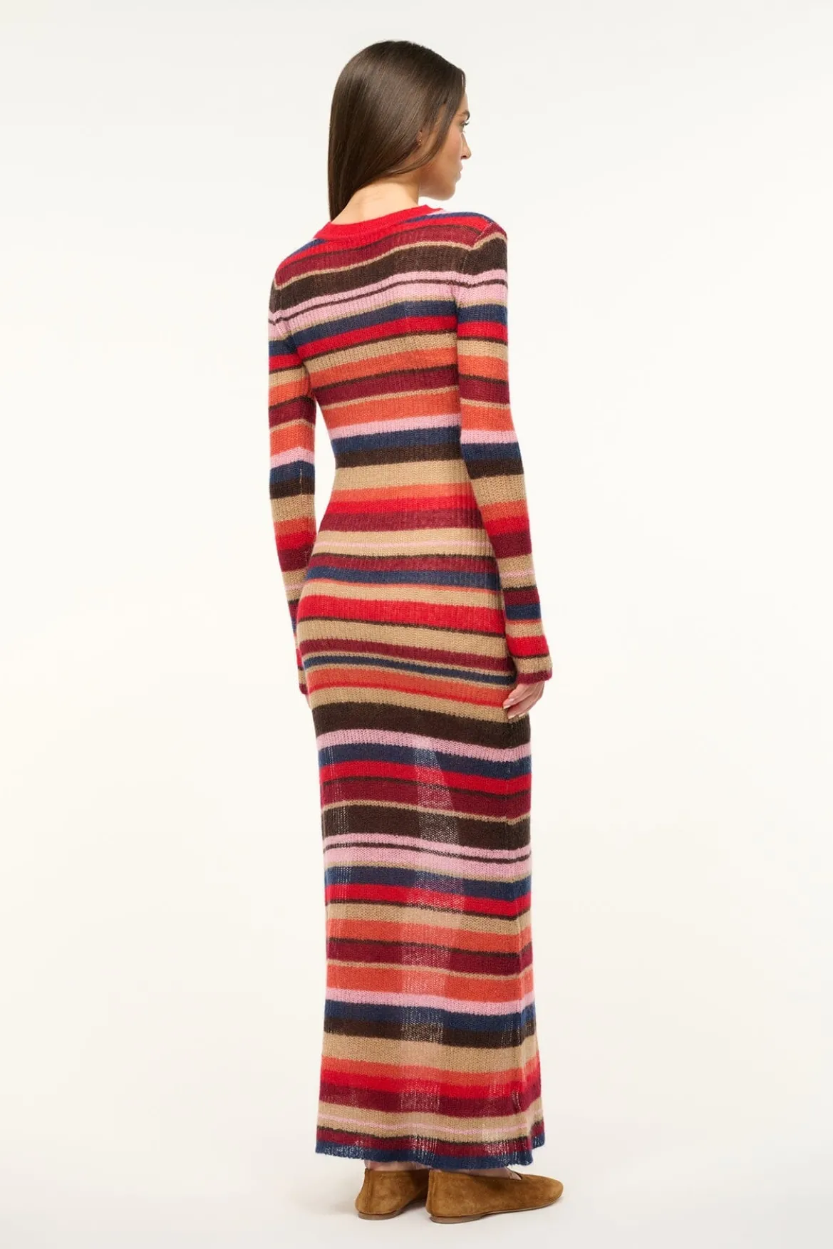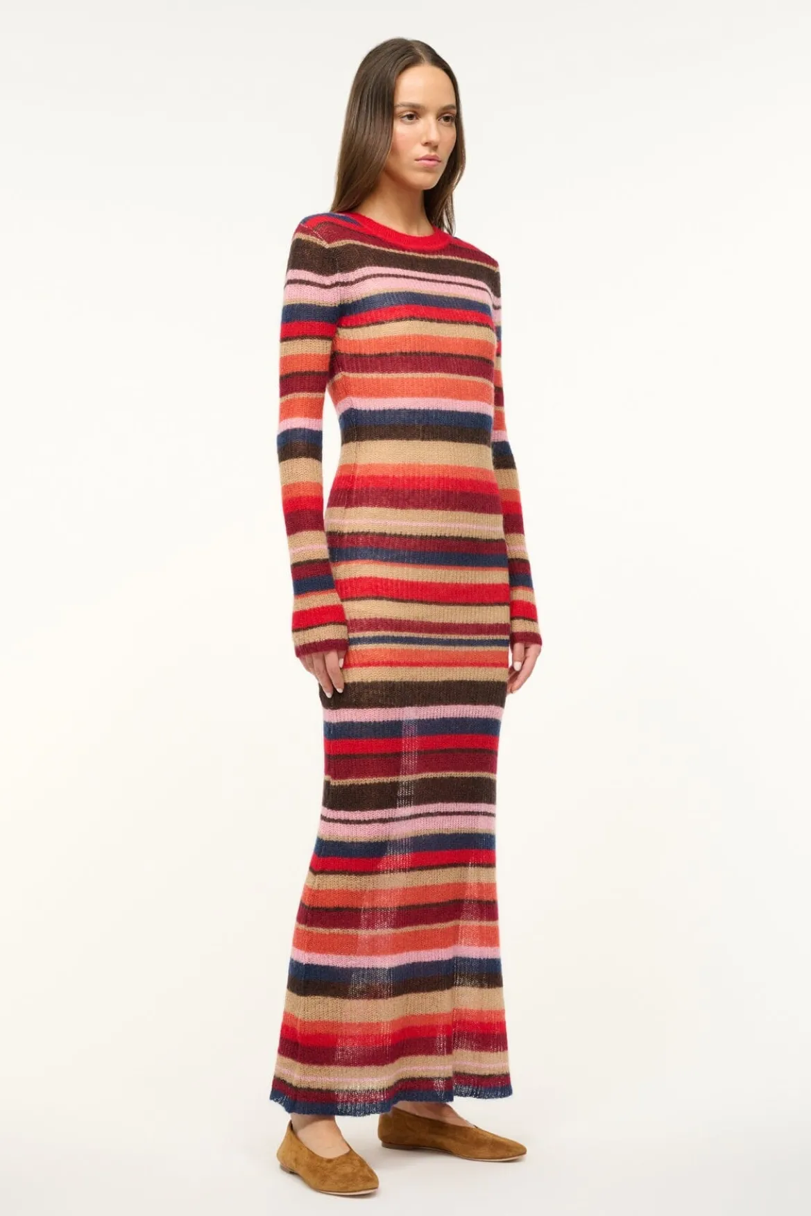 The Eiza is a maxi length knit dress with a crew neckline and long sleeves. This style is fitted throghout the bodice and includes a removable slip.