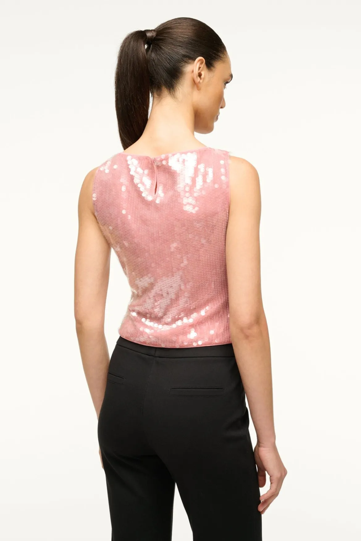The Eton Top is a boatneck sequined top with asymmetric draping at the waist and a button closure. It can be paired with the Casey Skirt for a matching set.