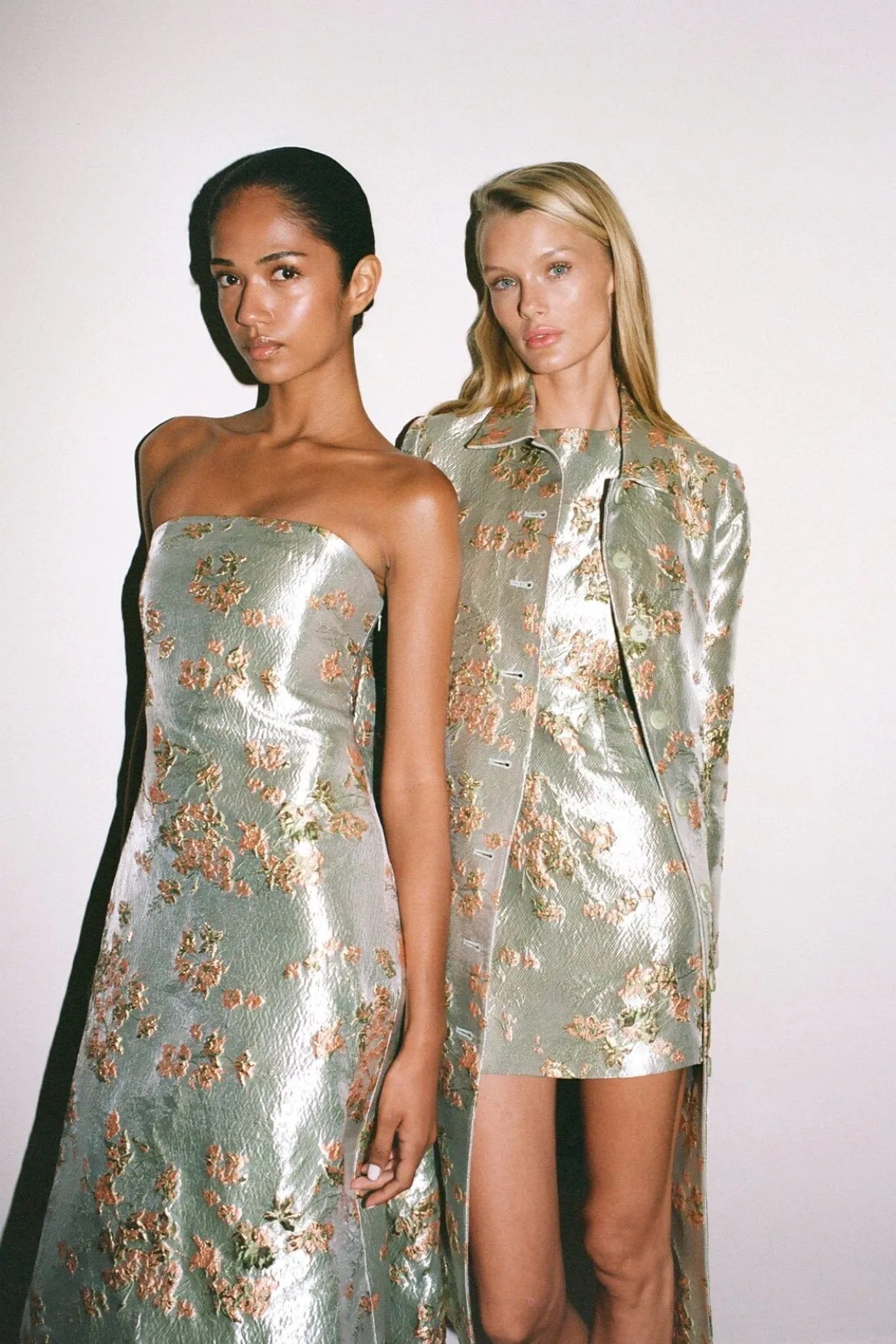 The Garden Dress is a mini shift dress crafted in a metallic brocade fabric with a fitted waist and center back zipper. Pair it with the matching Antoinette Coat for a coordinated set.