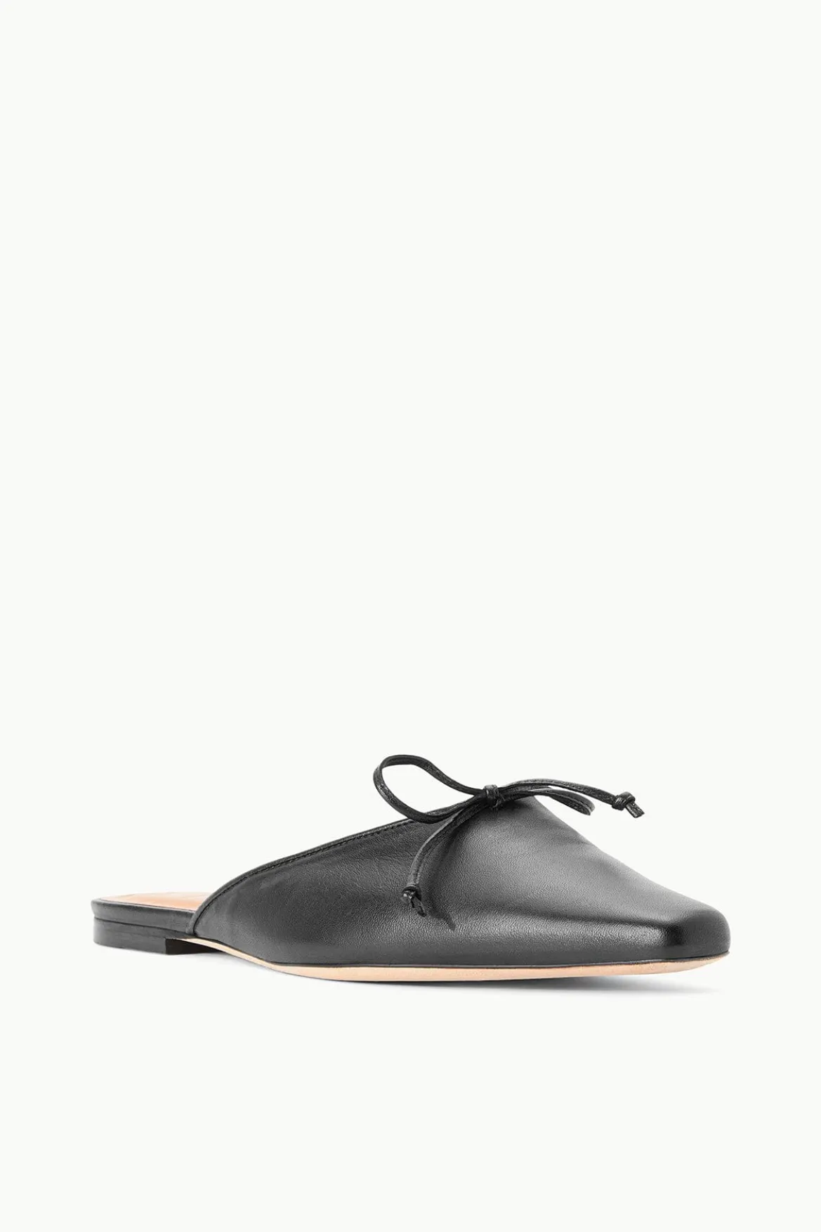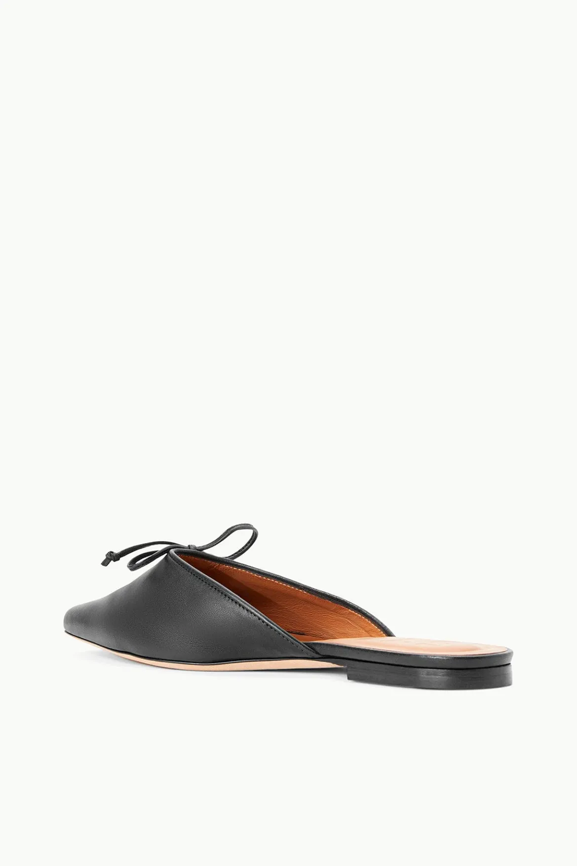 A flat leather mule, the Gina features a sleek pointed toe and bow detail.