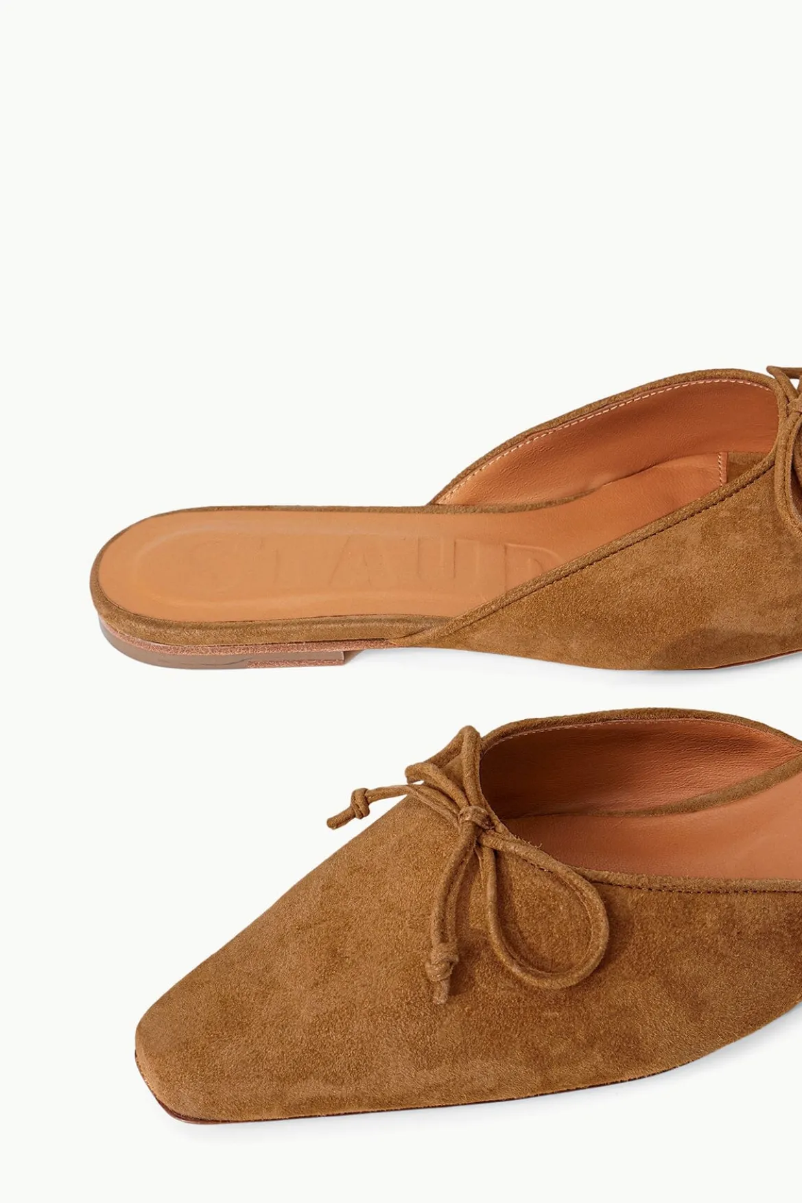 A flat suede mule, the Gina features a sleek pointed toe and bow detail.