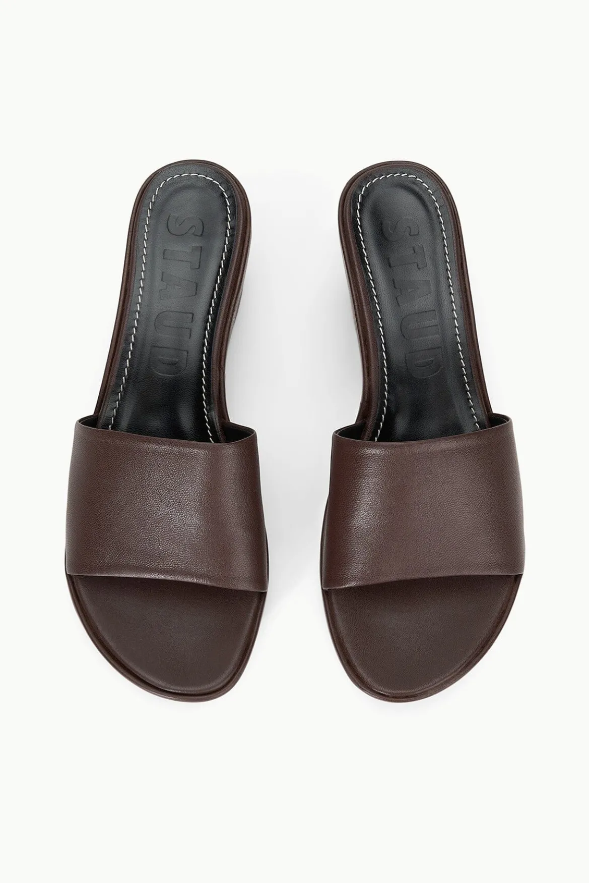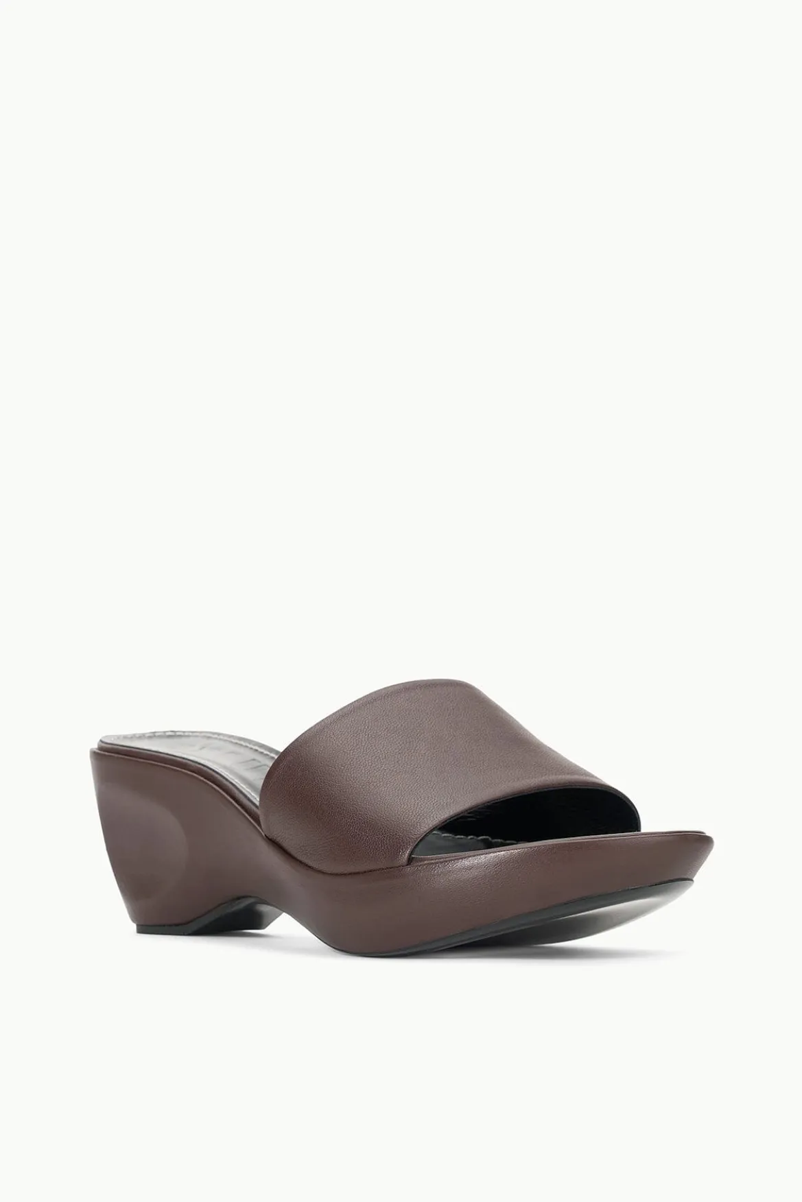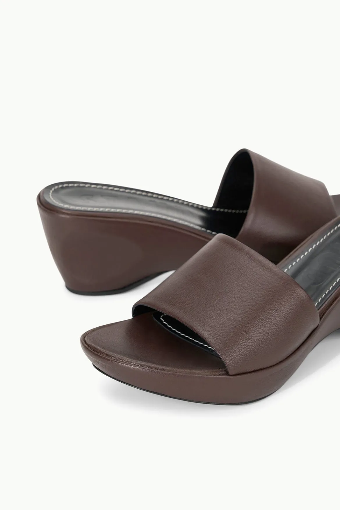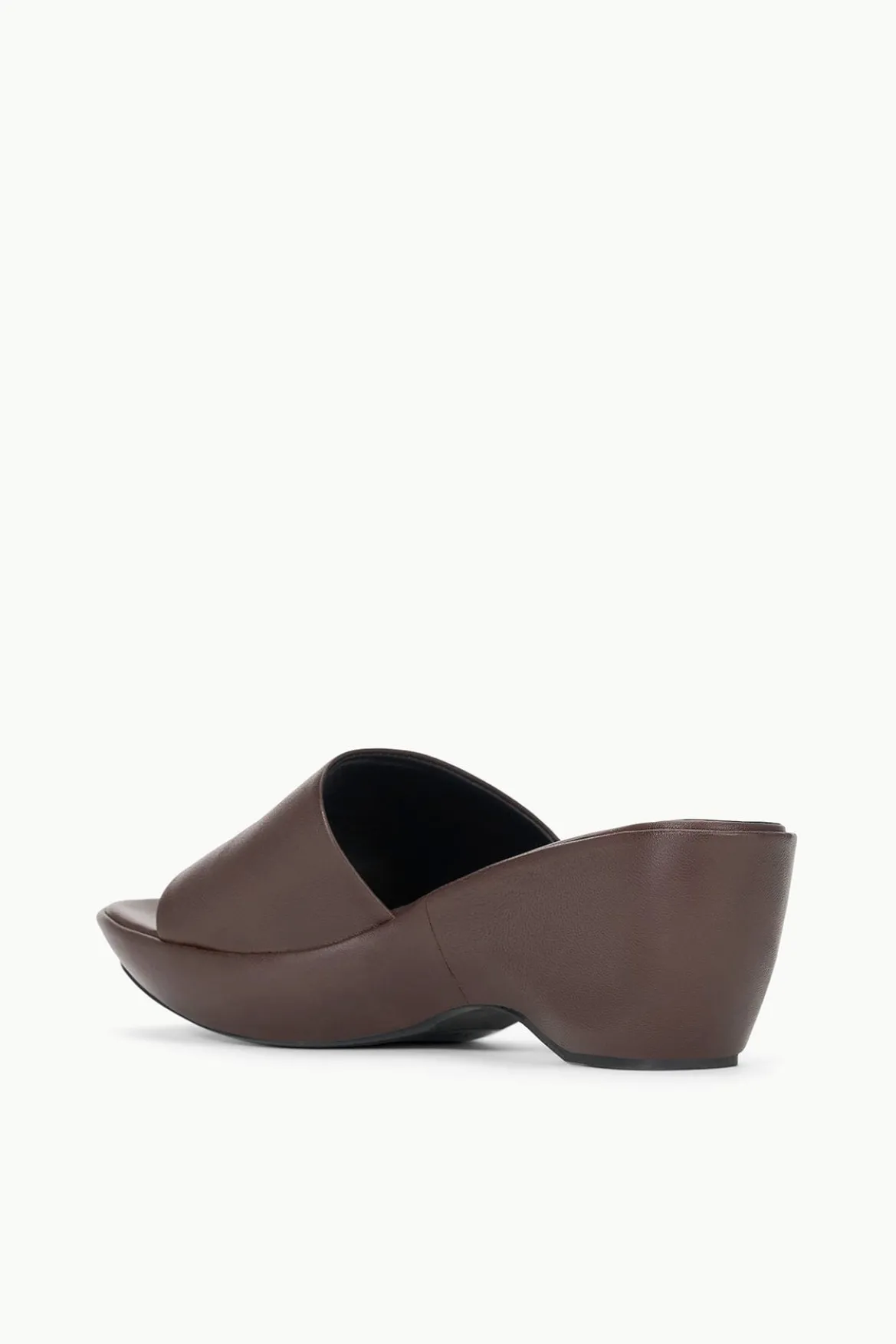 The Ginny Wedge is a platform slide, featuring a leather-wrapped wedge, a rounded toe, and a sleek leather band upper.