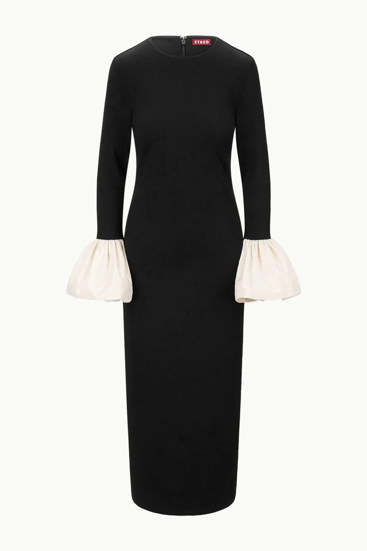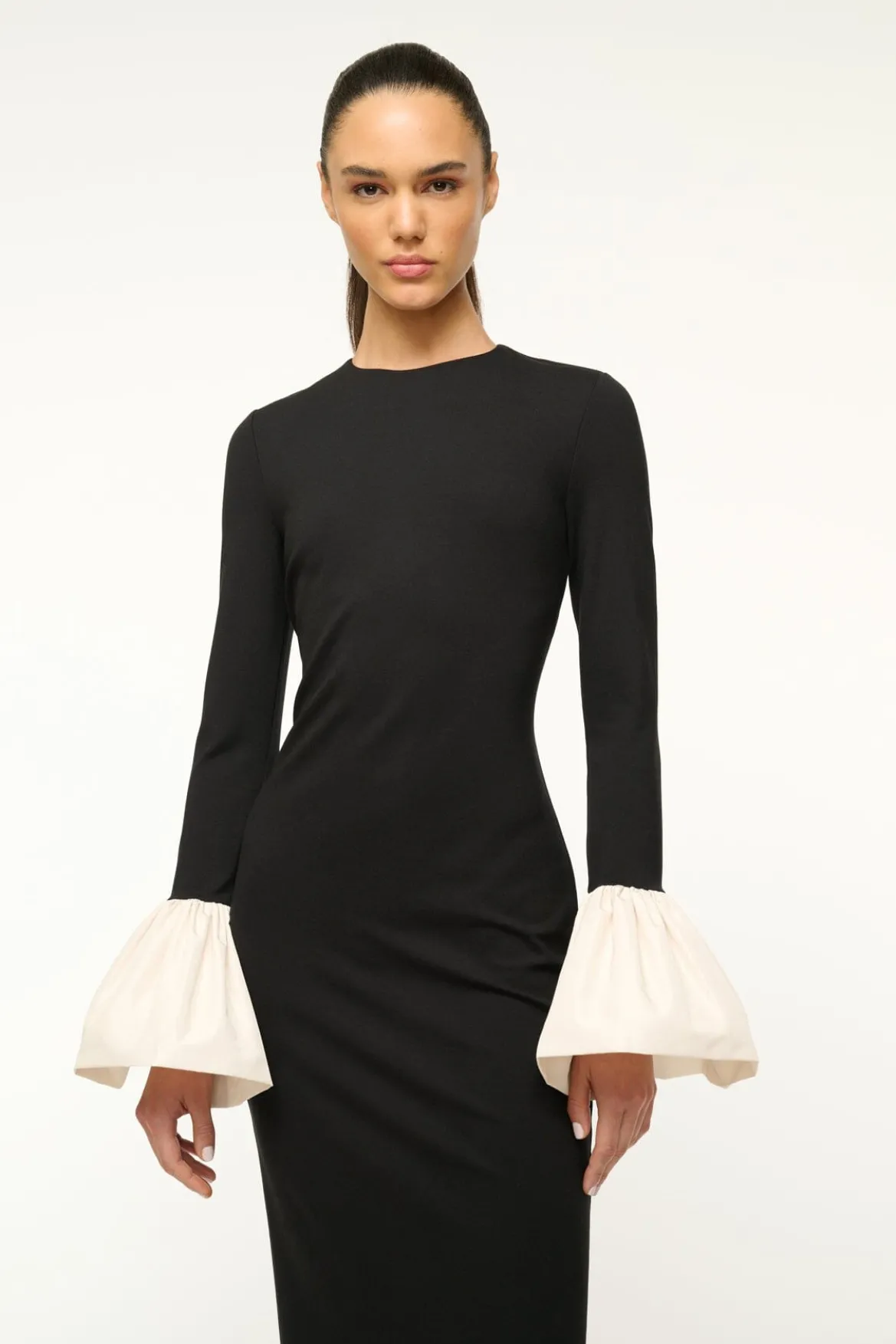 The Hawthorne Maxi is a boatneck cocktail dress made from our comfortable ponte fabric. It features voluminous ivory taffeta cuffs for a playful occasion look.