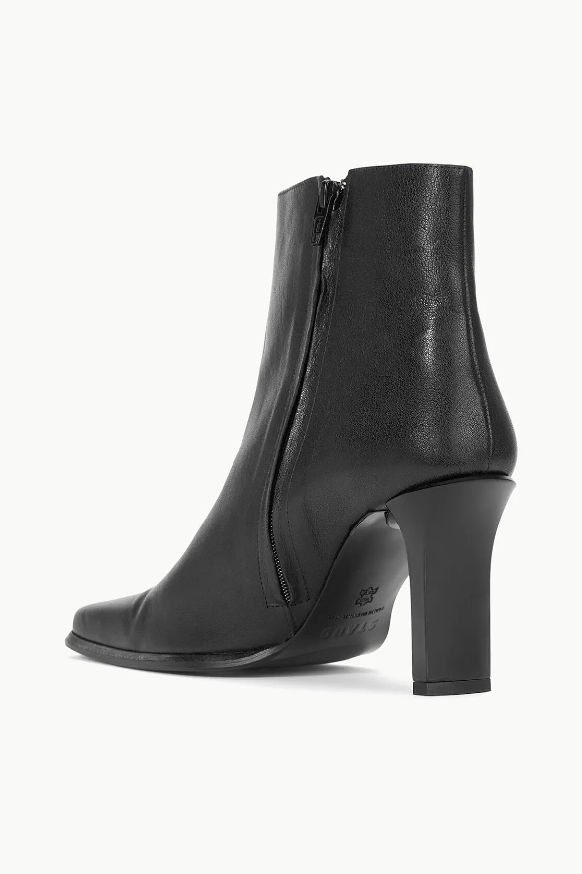 The Hendrix Ankle Boot is a high heel boot with an inside zipper and a square toe box. It features a wide heel and leather lining.