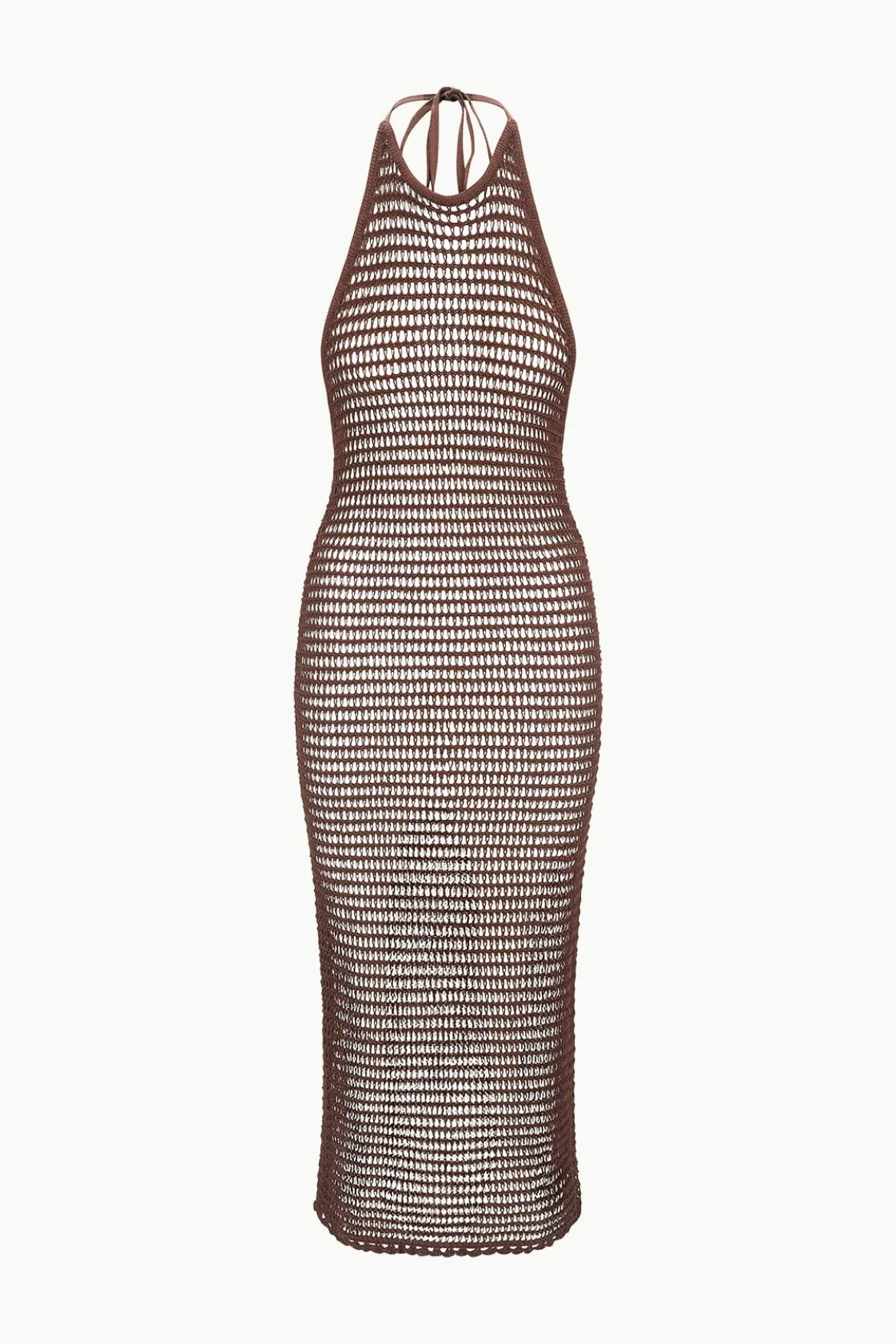 The Jade is a sexy halter-neck crochet cover-up, featuring an open weave, a tie at the neck, and low scoop back.