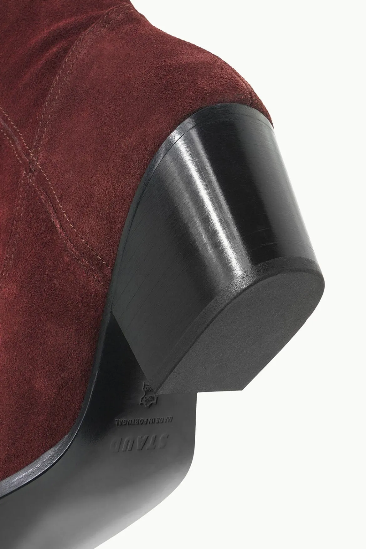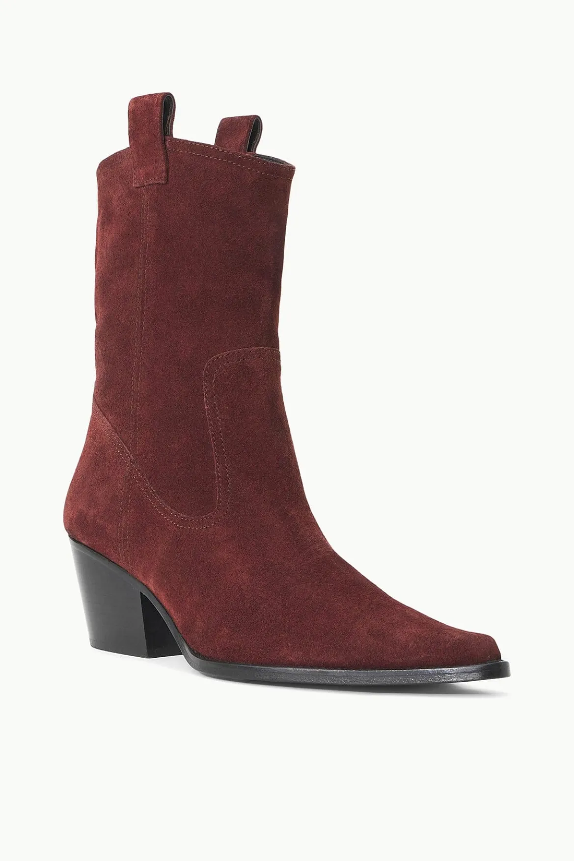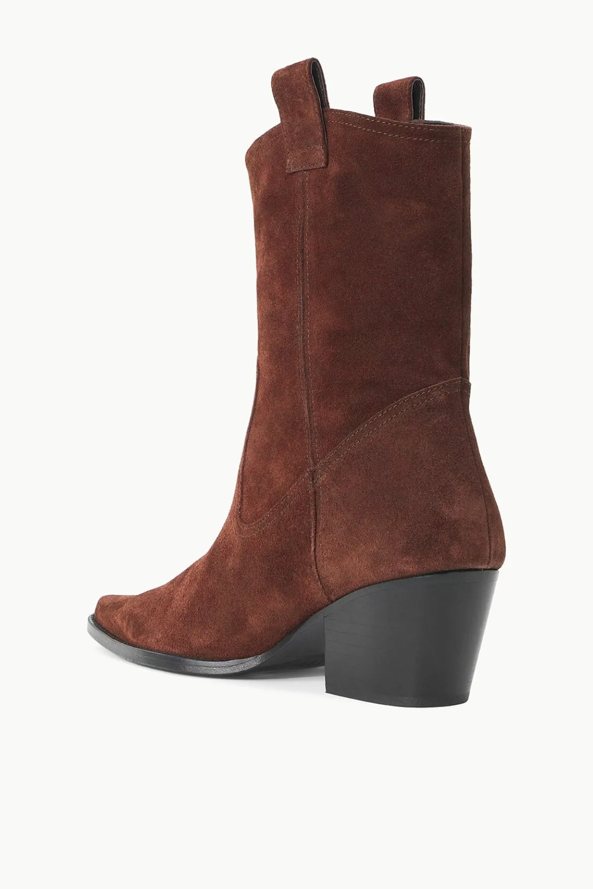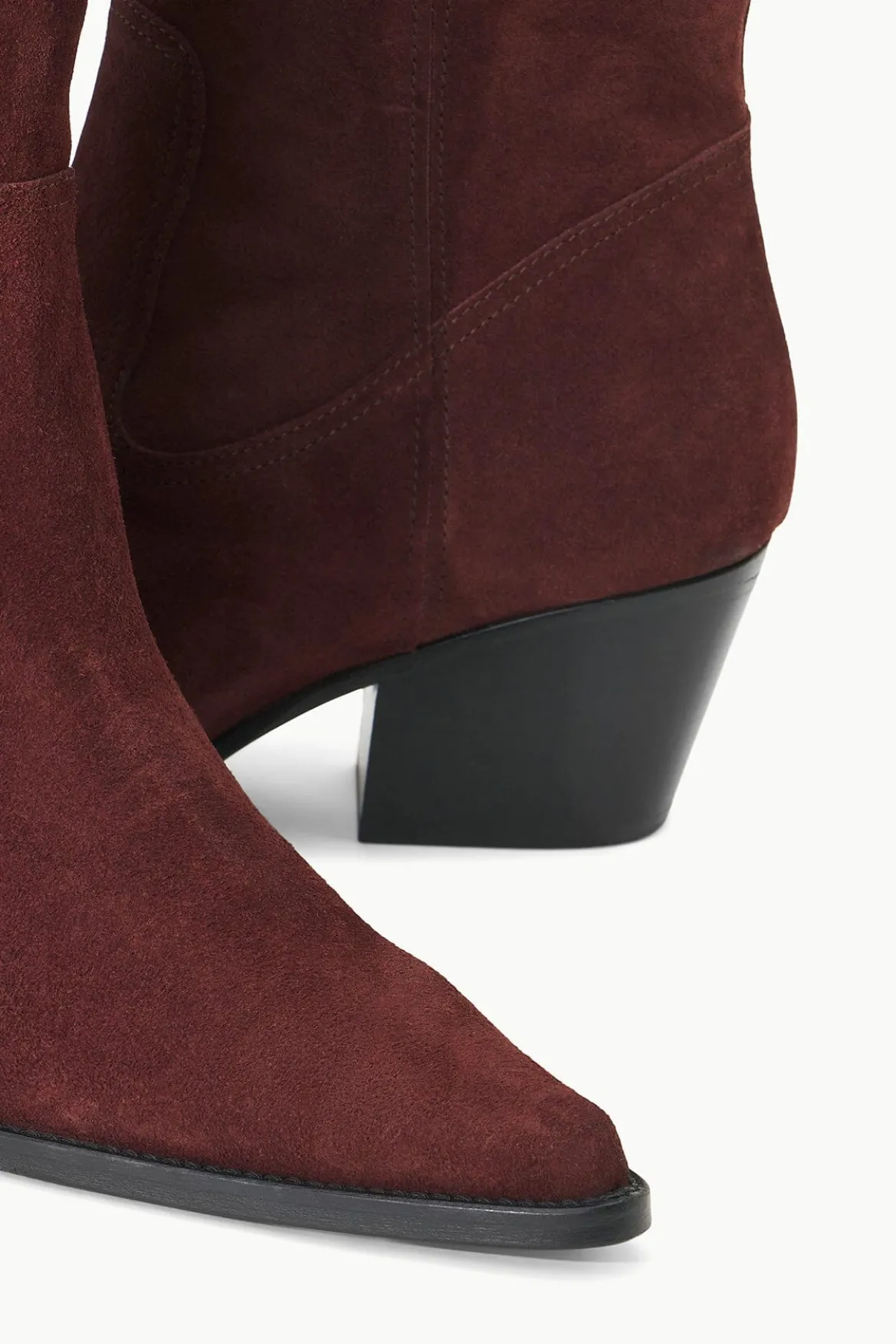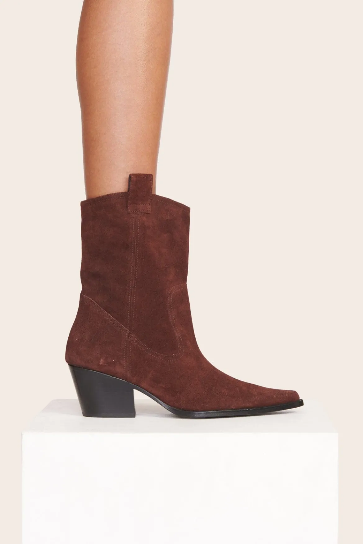 New for the season, the June is a true pointed toe cowboy boot made from soft suede with contrast stitching. This style features western seaming and cuban heel.