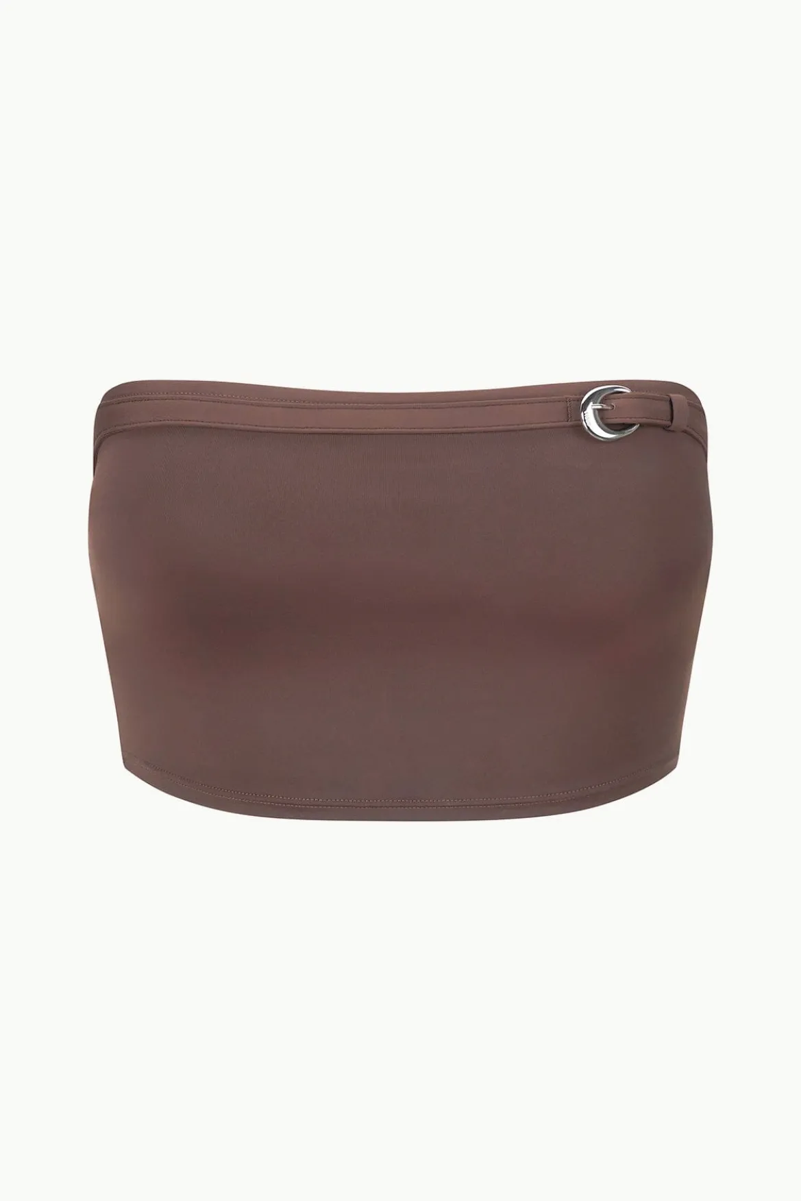 A tube top-inspired strapless bikini top made from our stretchy jersey fabric. The Juno features a crescent moon-shaped buckle detail at the bust and completes a set when worn with the matching Gemma Bikini Bottom.