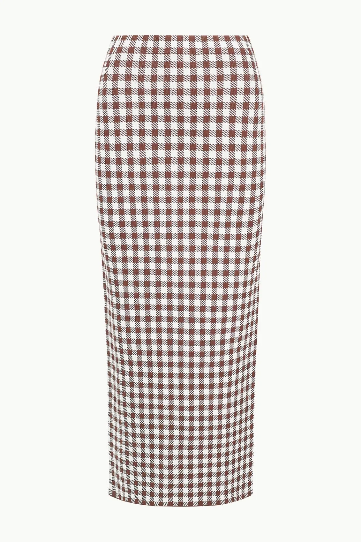 The Karina is a fitted ankle-length skirt made out of a stretchy compact knit fabric. It features a side slit and pairs back to the Montgomery Top for a matching set.