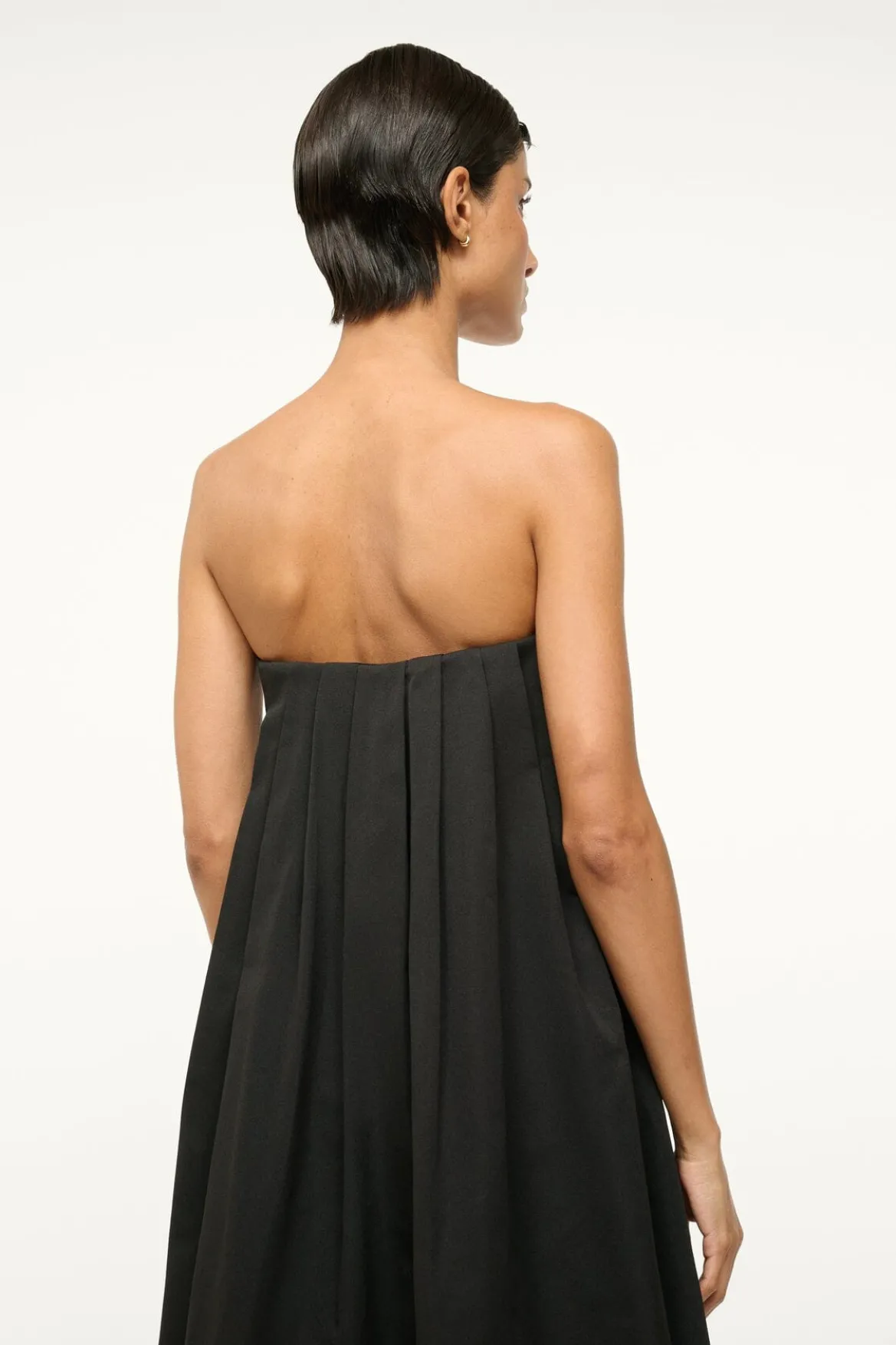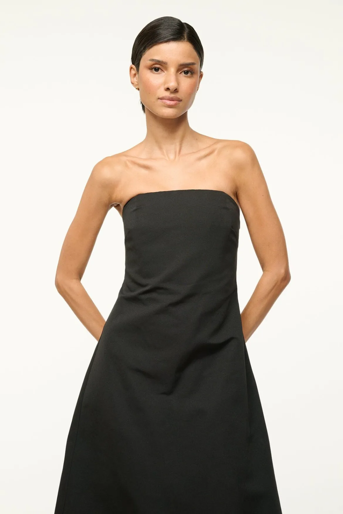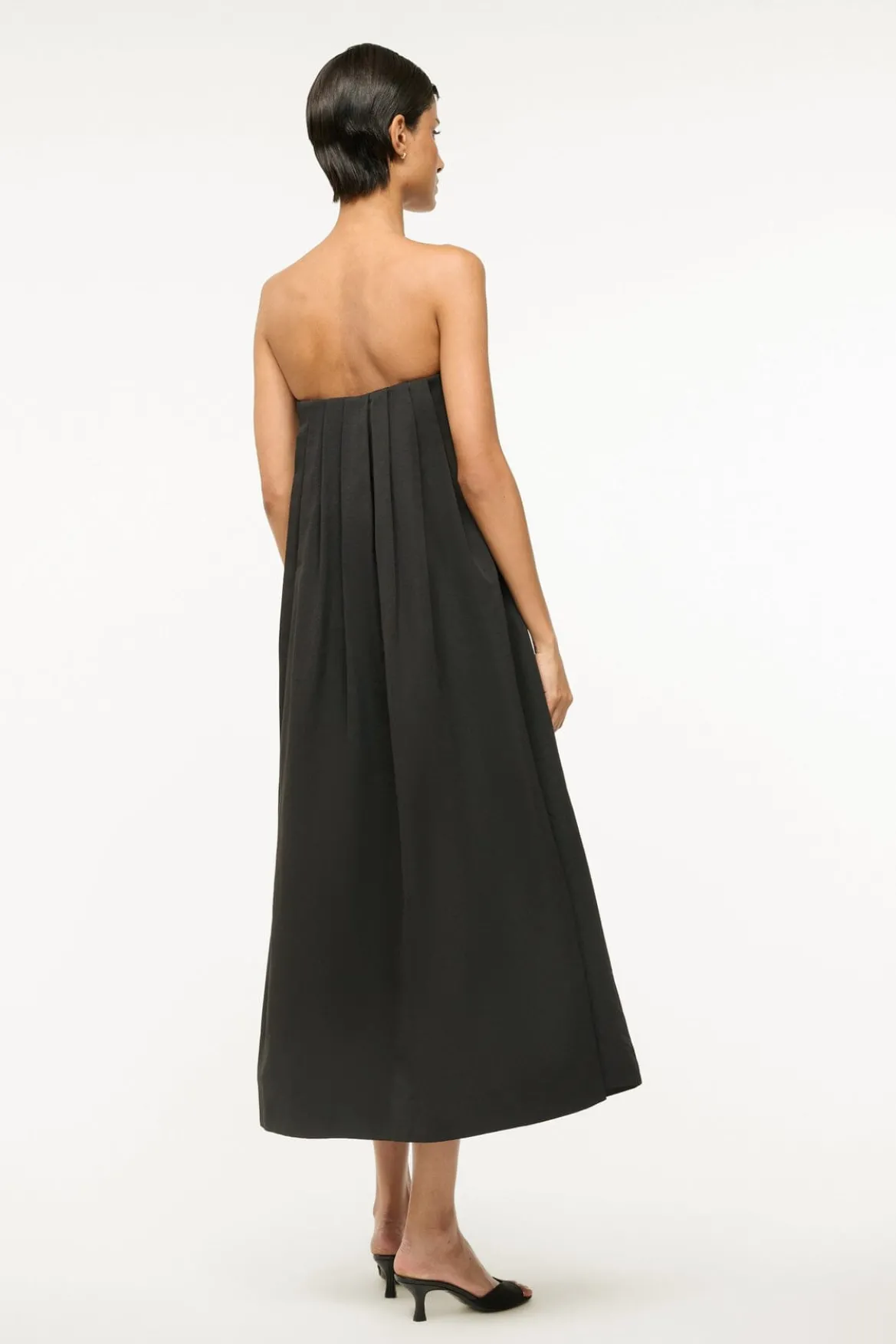 This is a strapless midi length gown with an interior corset and a pleated train at the back. The Kennedy is crafted from a grosgrain fabric making it perfect for a special occasion.