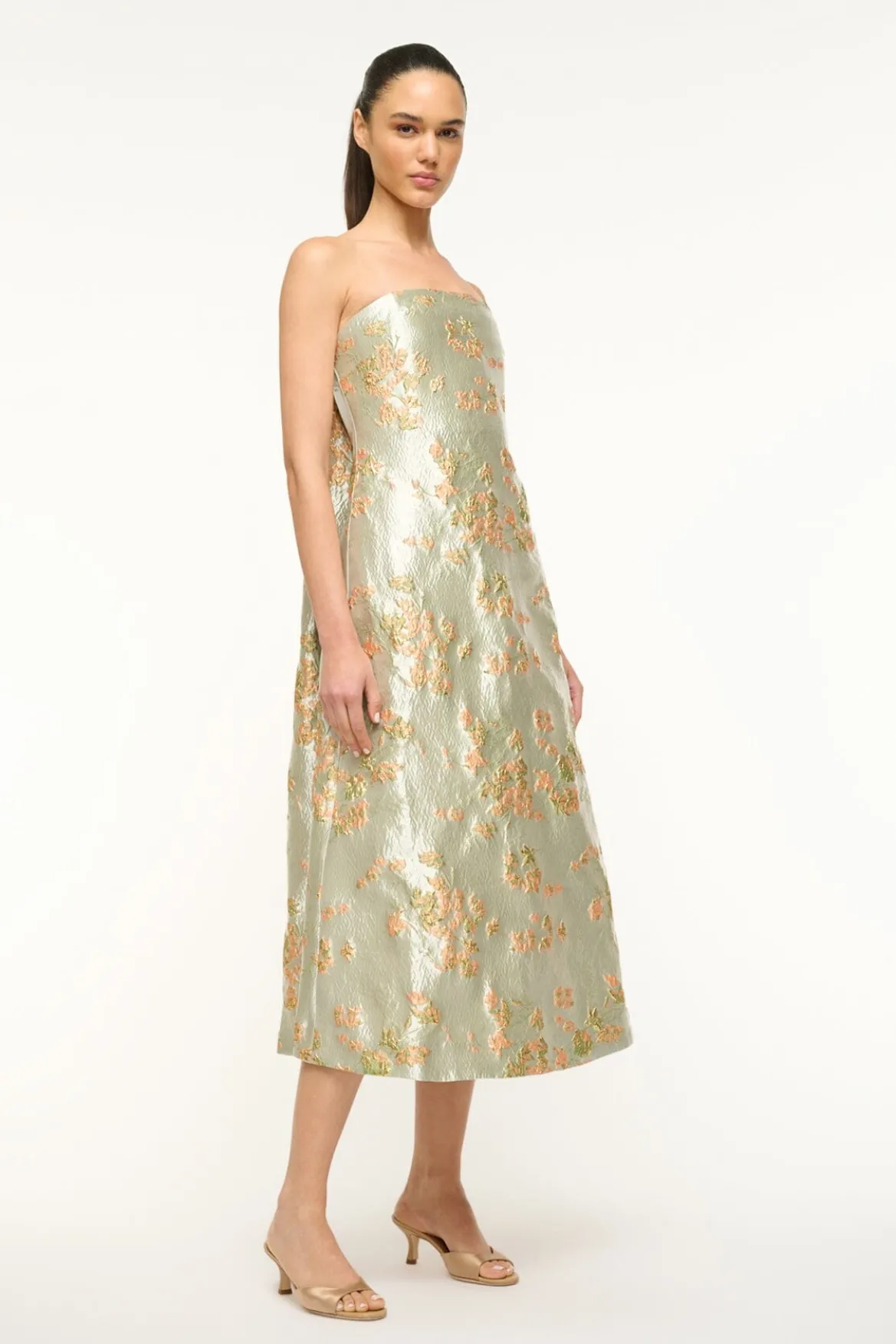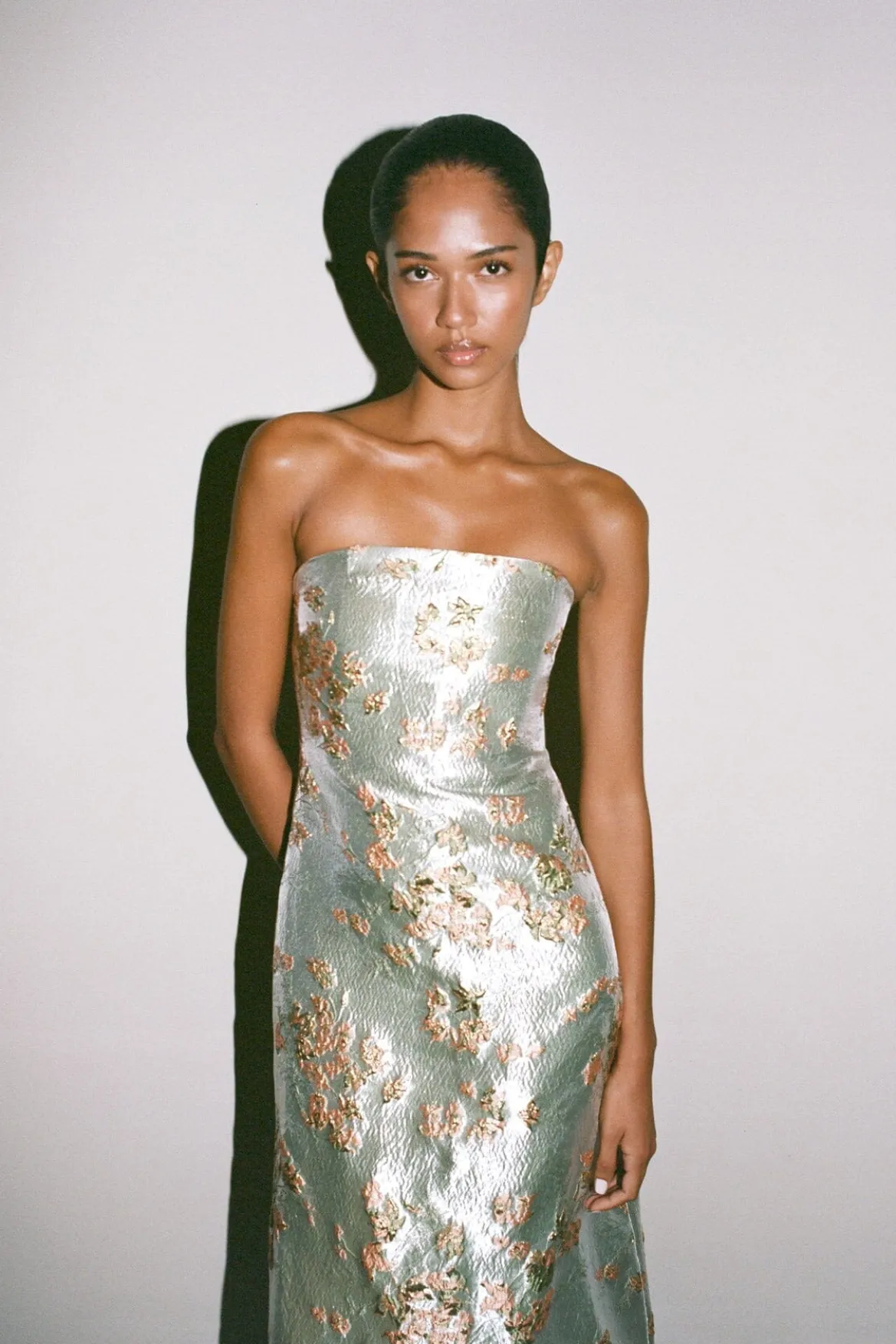 This is a strapless midi length gown with an interior corset and a pleated train at the back. The Kennedy is crafted from a metallic brocade fabric making it perfect for a special occasion.