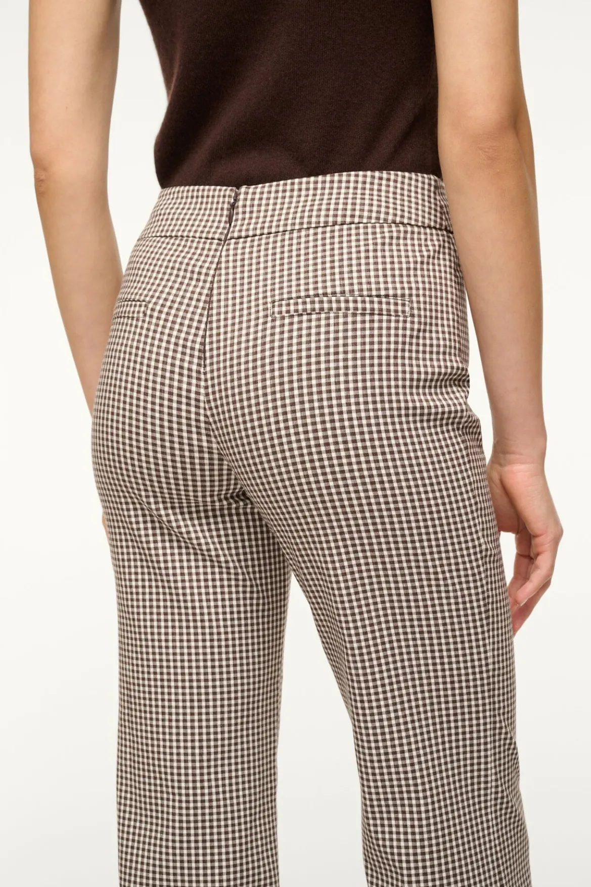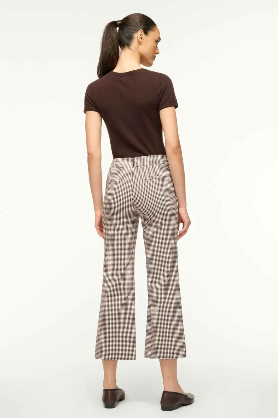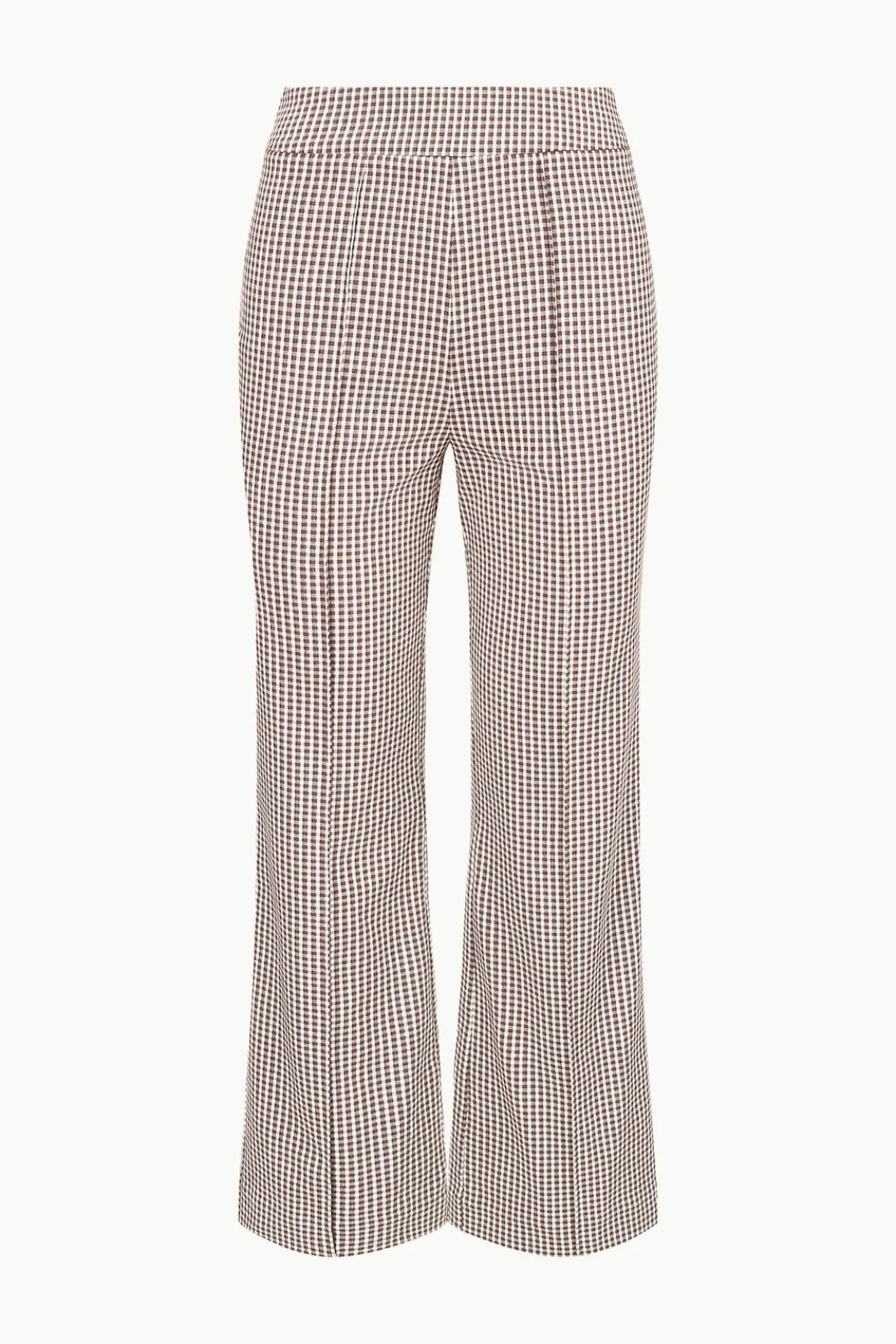An ankle length pant made out of a stretch suiting fabric with princess seams at the front and a center back zipper.