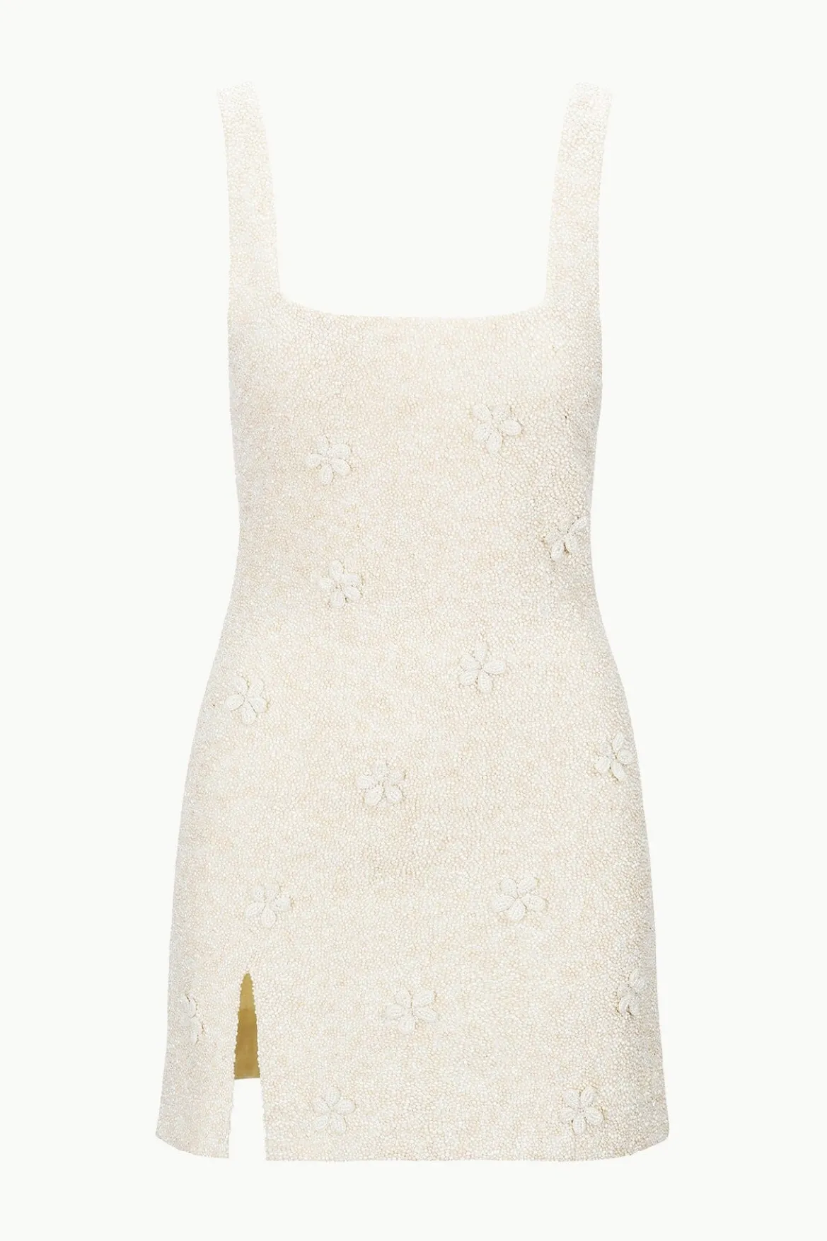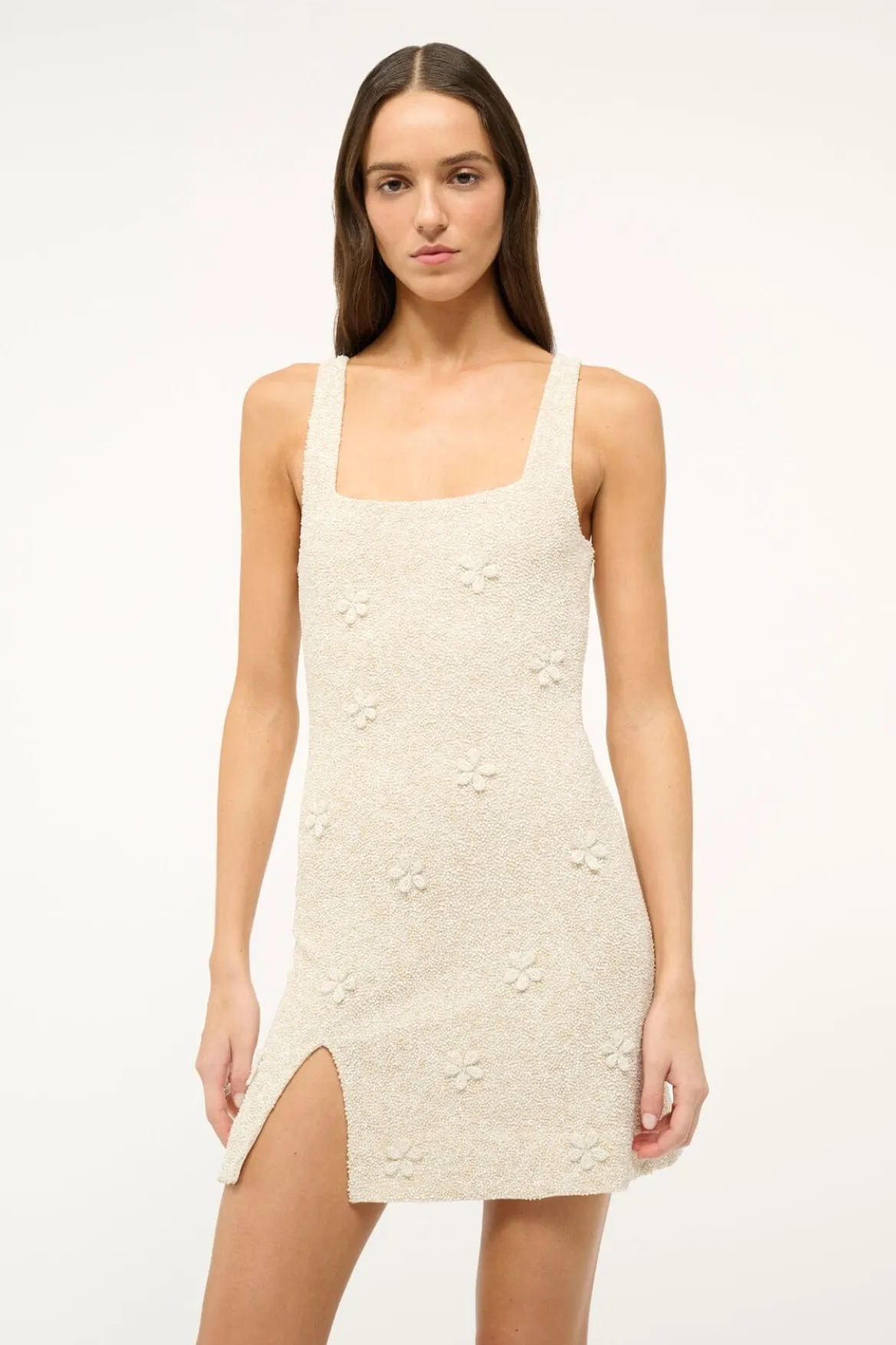 Our best-selling beaded mini dress has been updated in a three dimensional floral for the Spring season. The Le Sable is afully hand-beadeddress with a square necklineand a side slit.