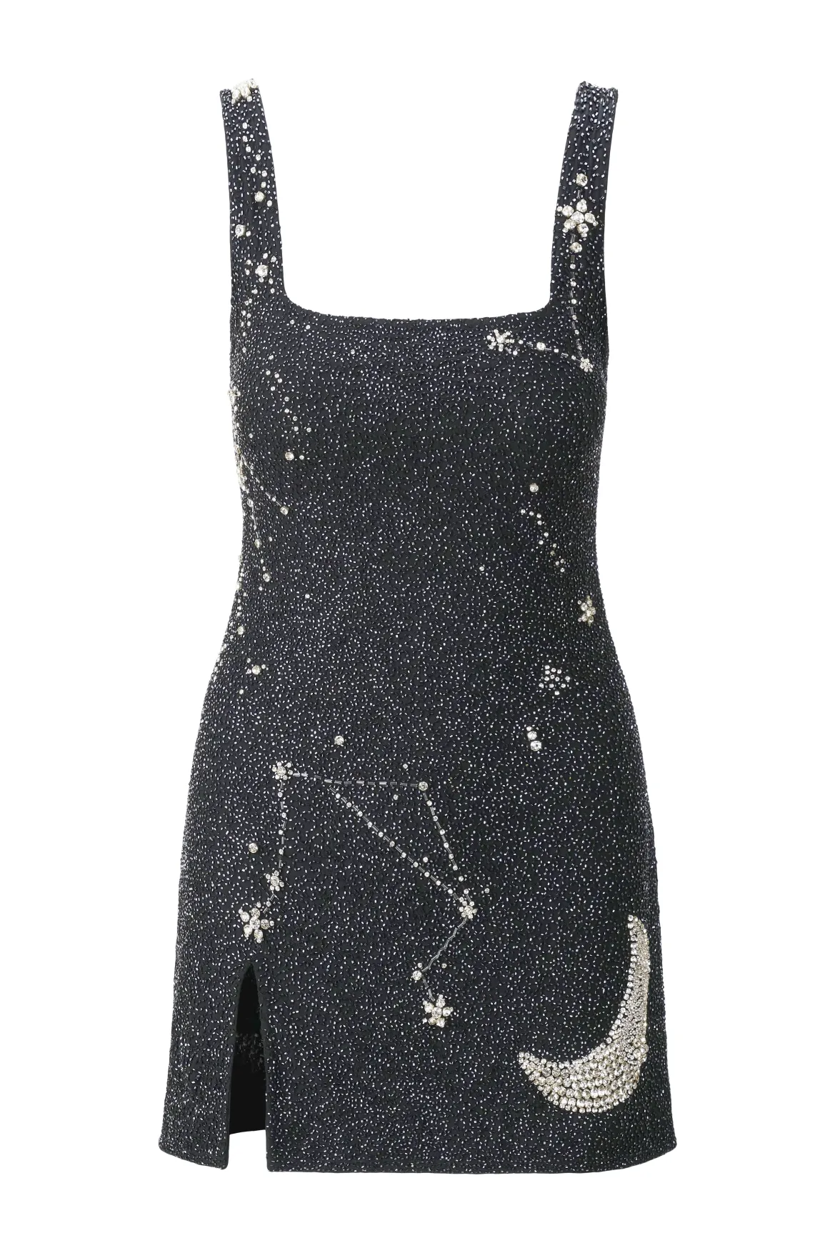 Our best-selling hand beaded mini dress has been updated in a constellation-inspired pattern for the Holiday season. This style is fully beaded and features a slit and a hidden side zipper.