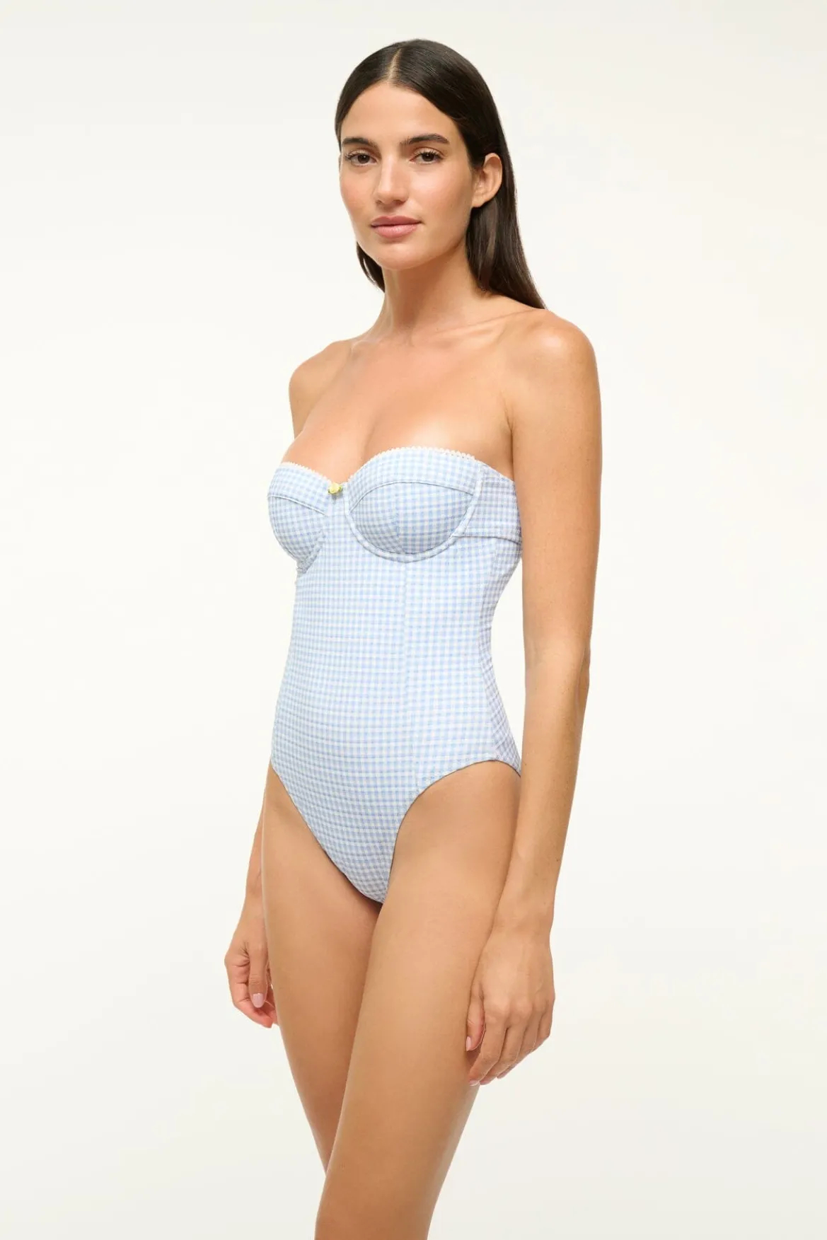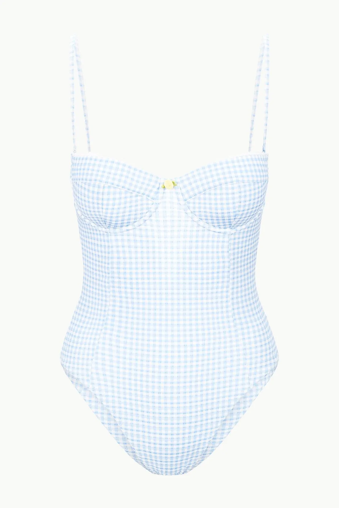 The Maeve One Piece features a bustier inspired bodice with a contrast trim at the bust. This style has removable spaghetti straps and a low back.