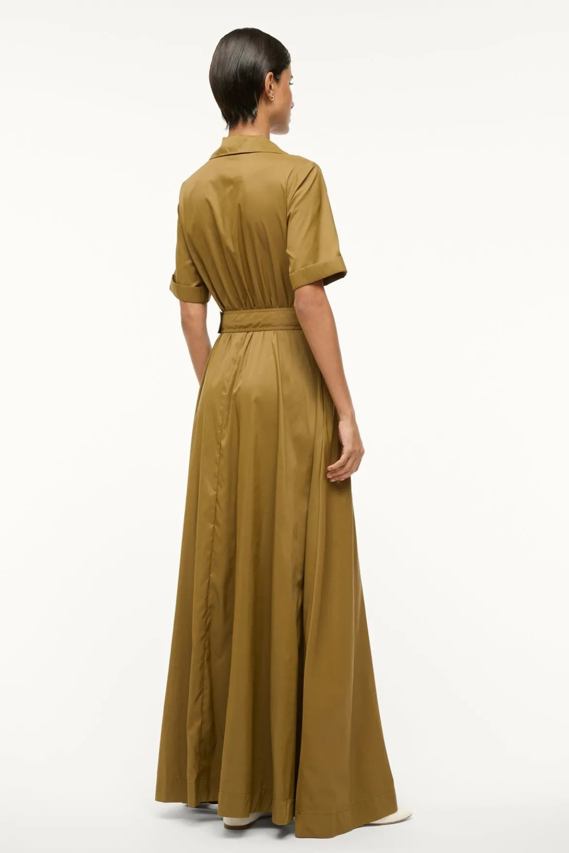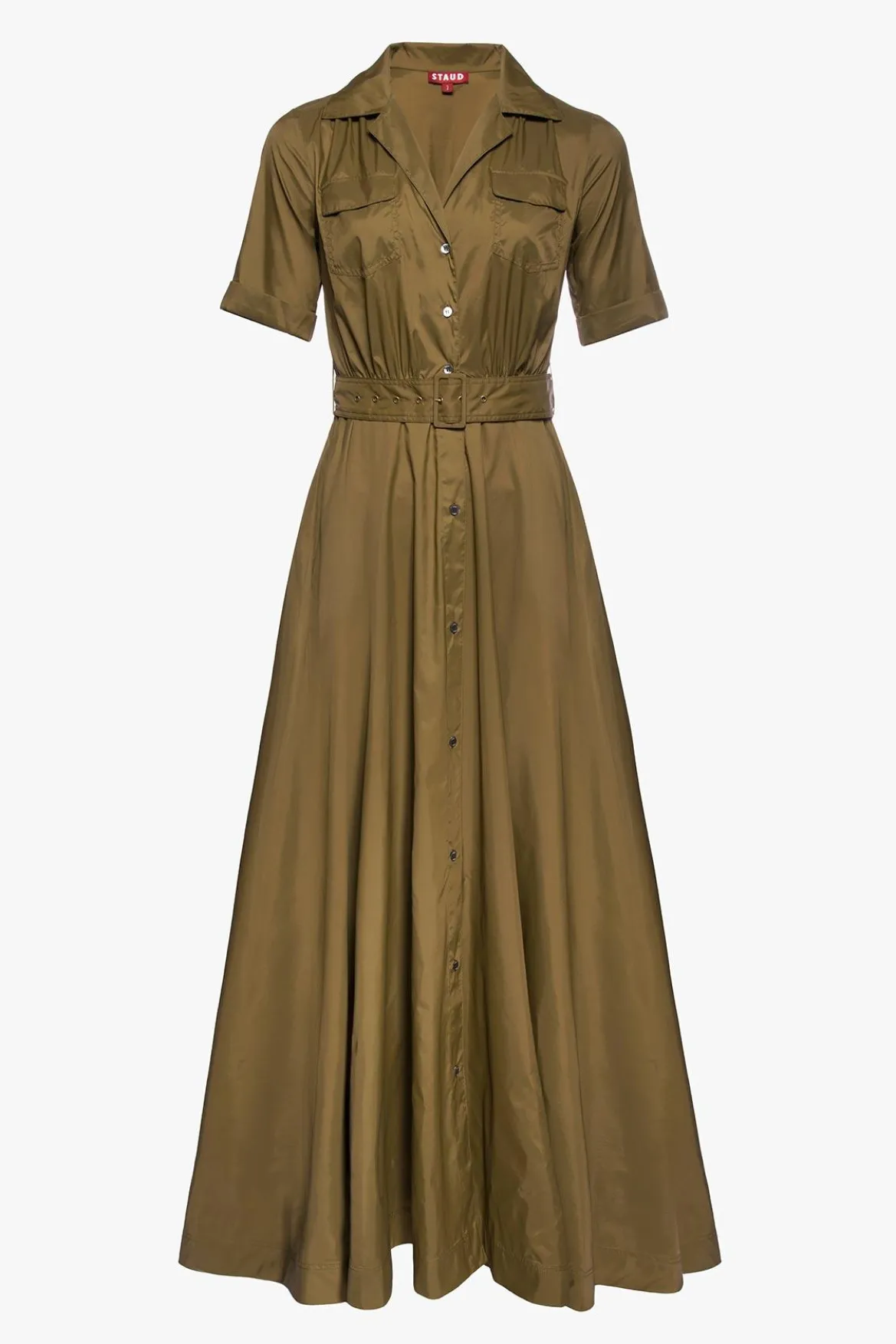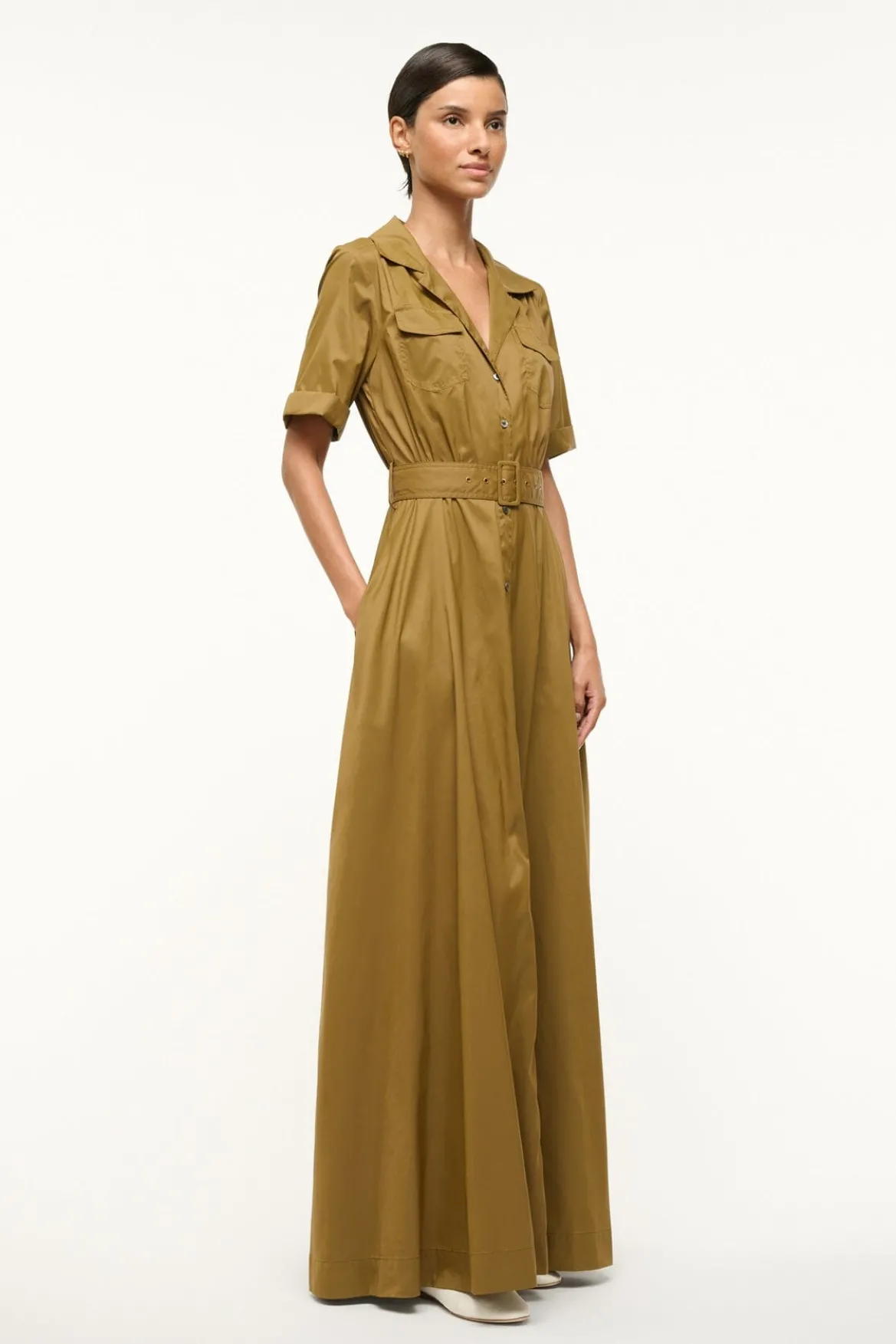 The Millie is a full length dress made out of our sustainable recycled tissue nylon. This dress features two front pockets, a button down front and matching belt.