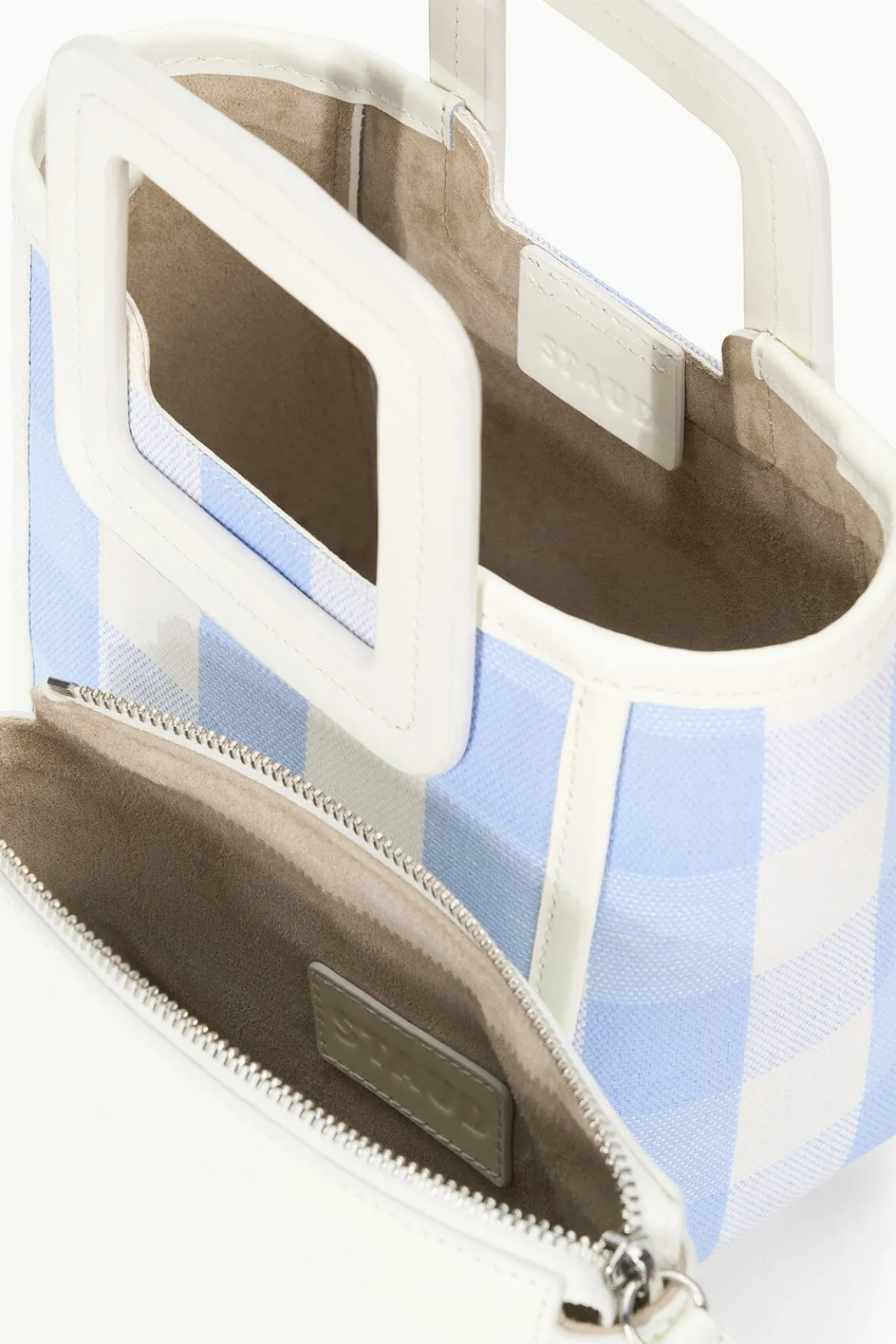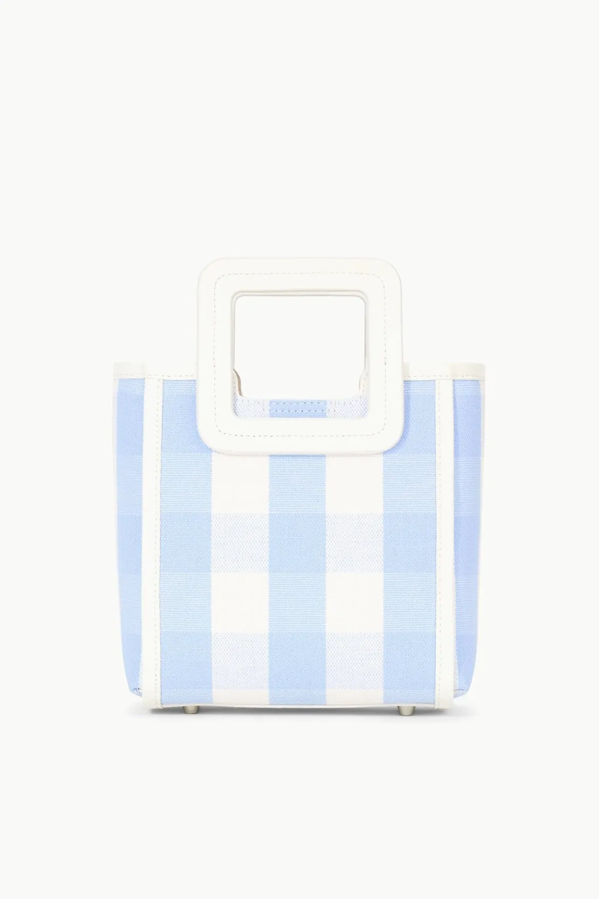 Our Mini Shirley Bag is back in a seasonal gingham print. Includes a removeable leather zip pouch and has an adjustable shoulder strap.