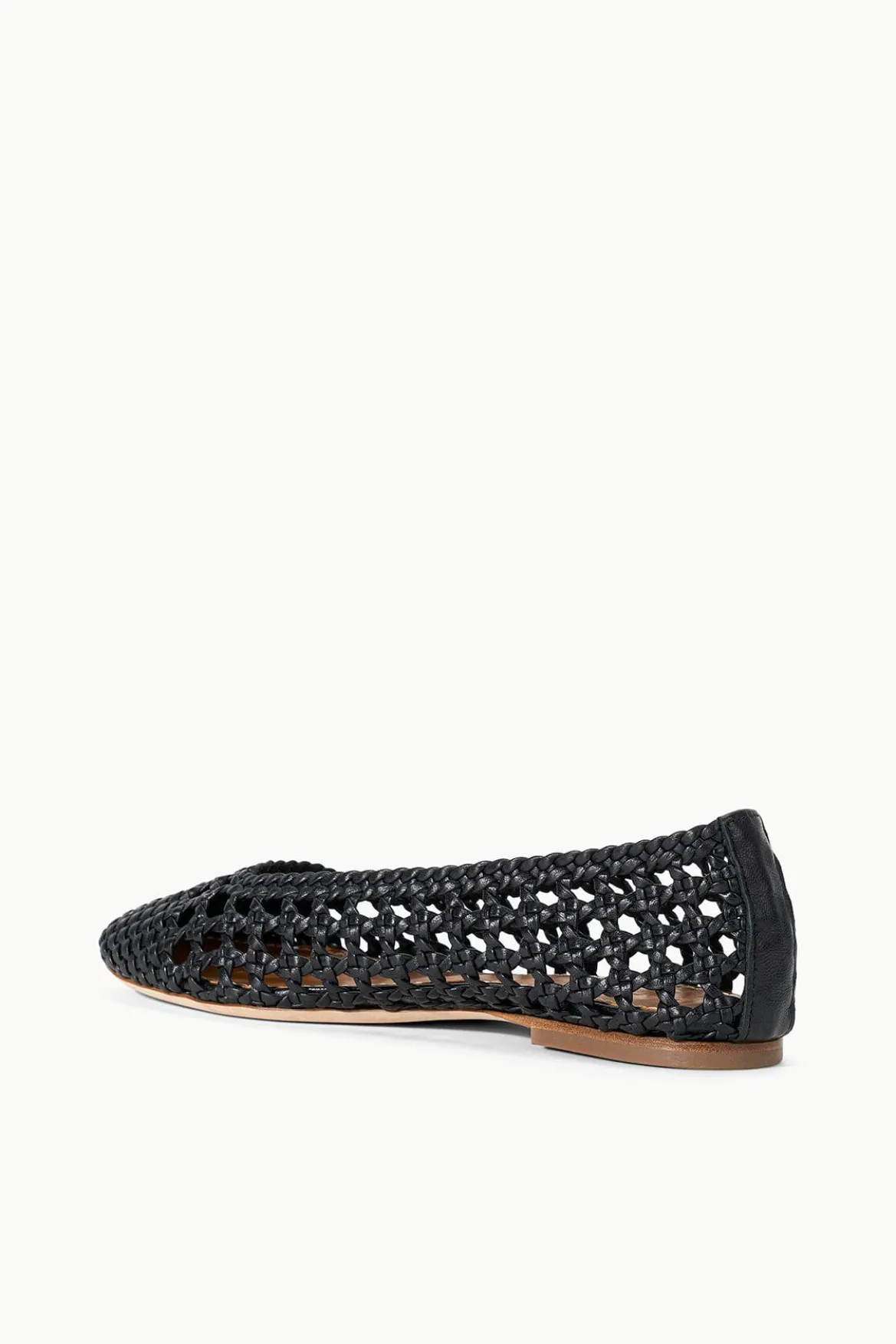 The Nell is a hand-woven ballerina flat with a round cap toe in black leather. This style features a cushioned leather footbed and leather sole with a rubber heel cap.