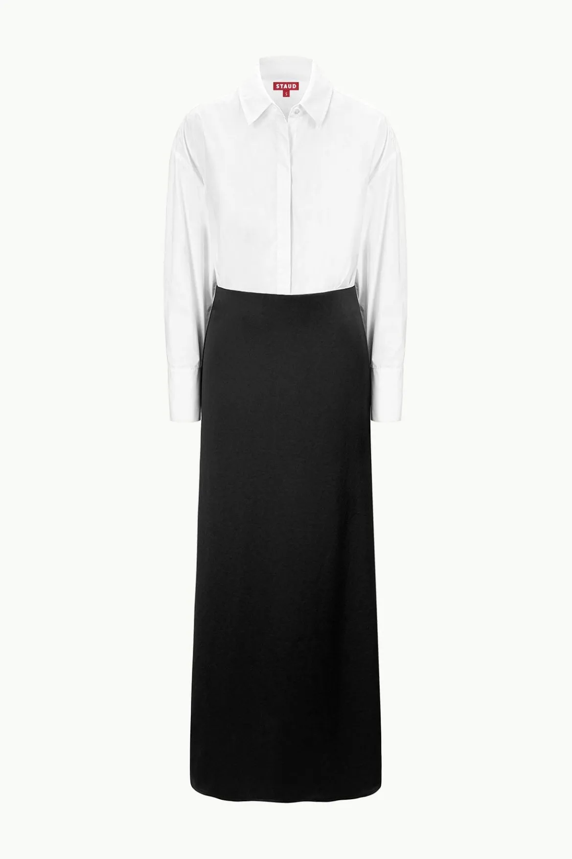 The Nile is a maxi length dress with a poplin shirt bodice and a contrasting satin skirt. It features a hidden side zipper and functional center front buttons for ease.