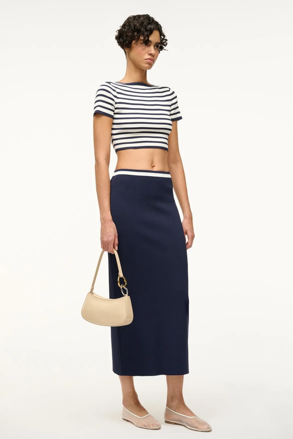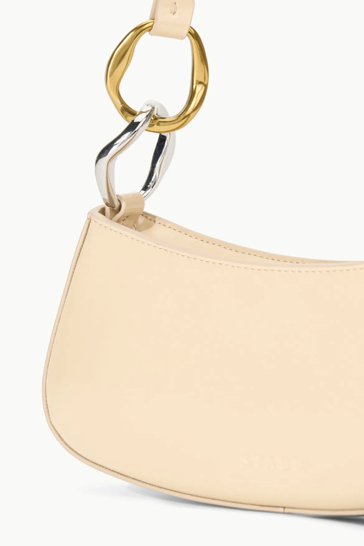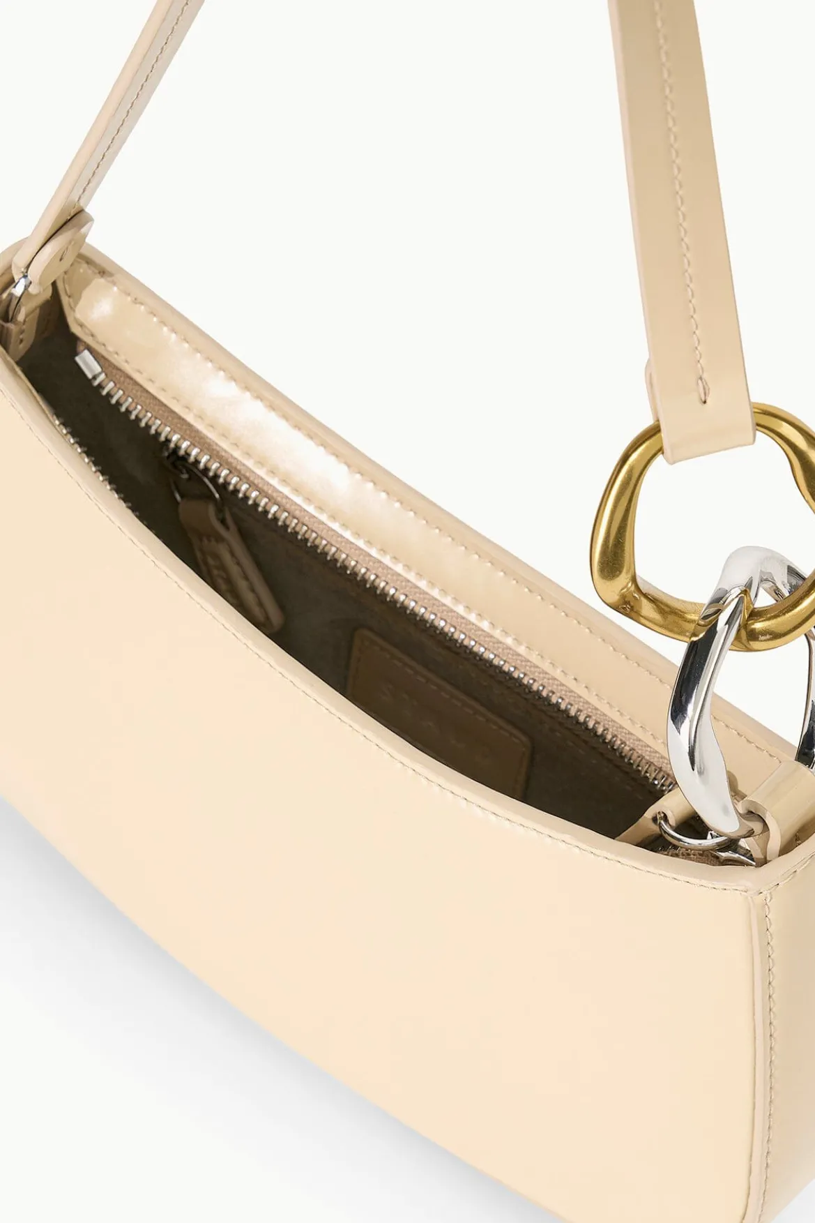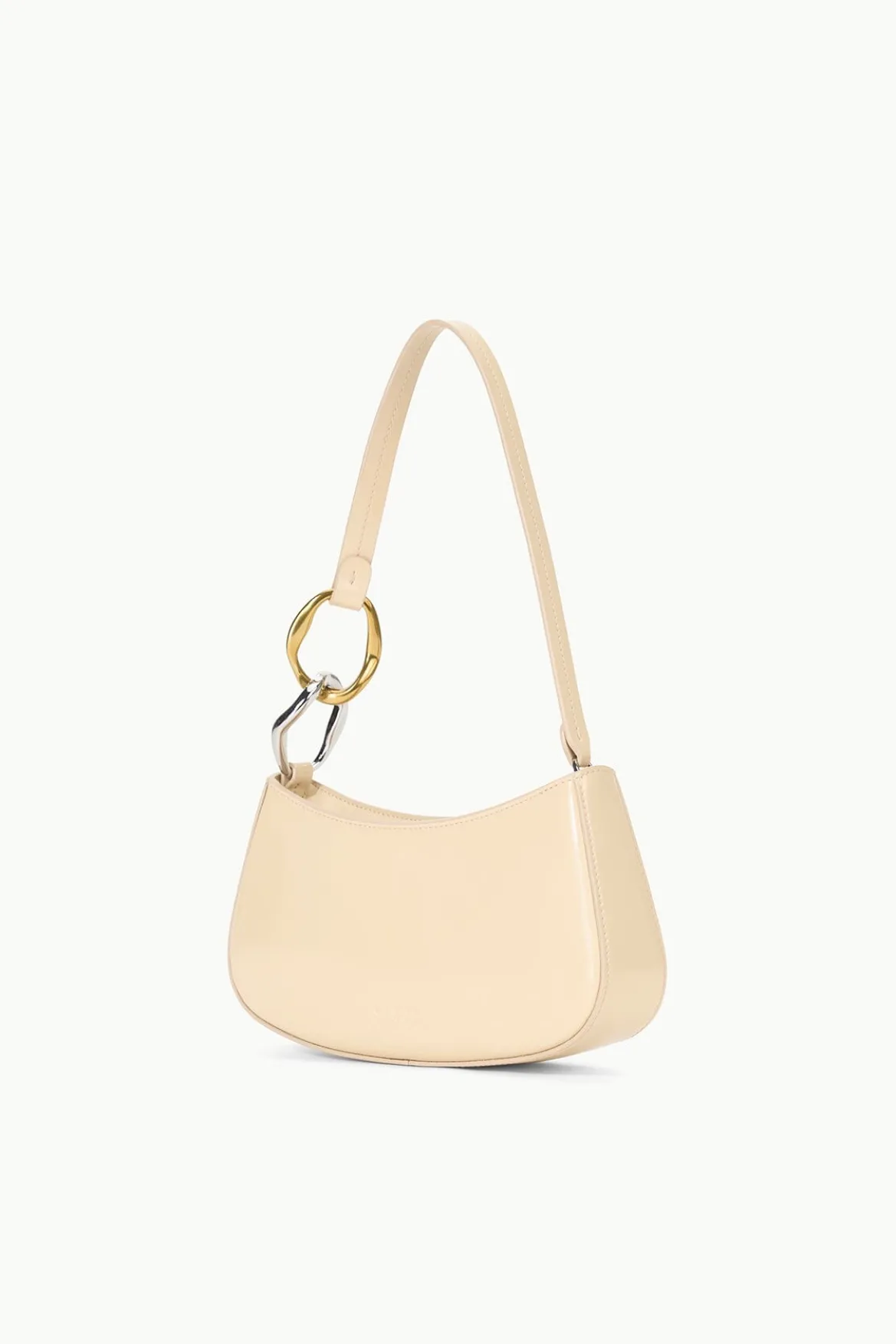 The Ollie Bag is a mini shoulder bag made out of polished leather. This style features mixed metal hardware on the strap and a zip closure.