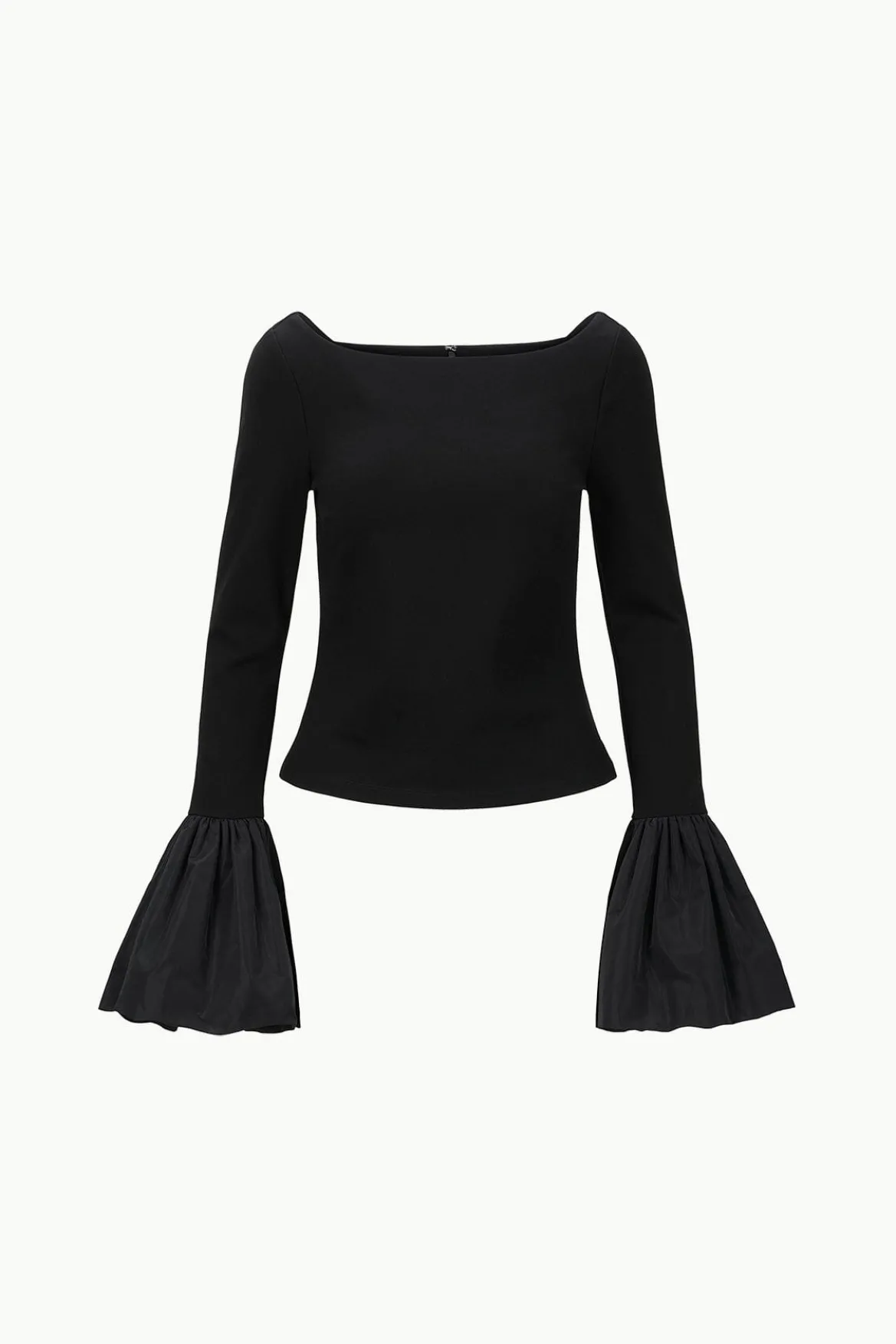 The Paige Top is a festive blouse in our comfortable ponte fabric, with voluminous taffeta bell cuffs. This style pairs with our Presley Pant.