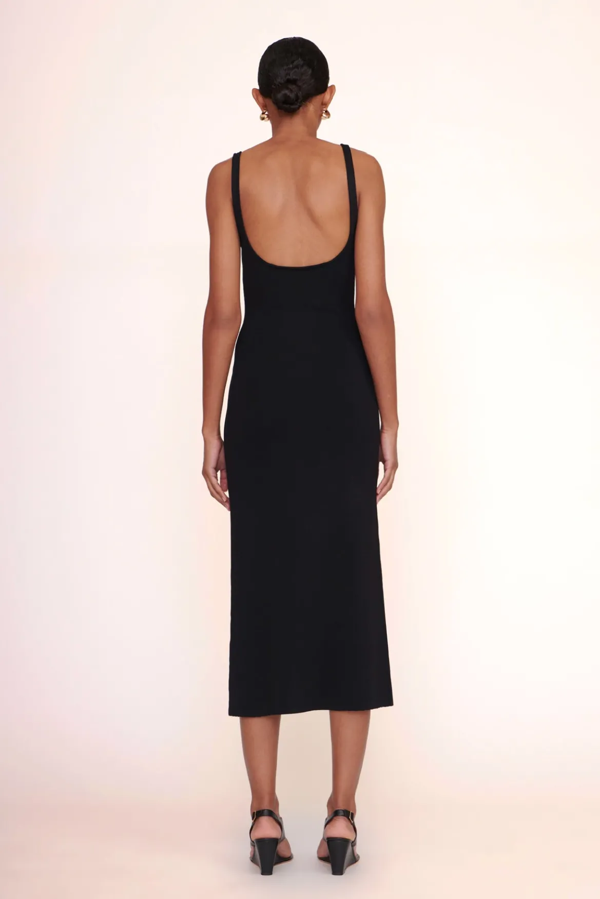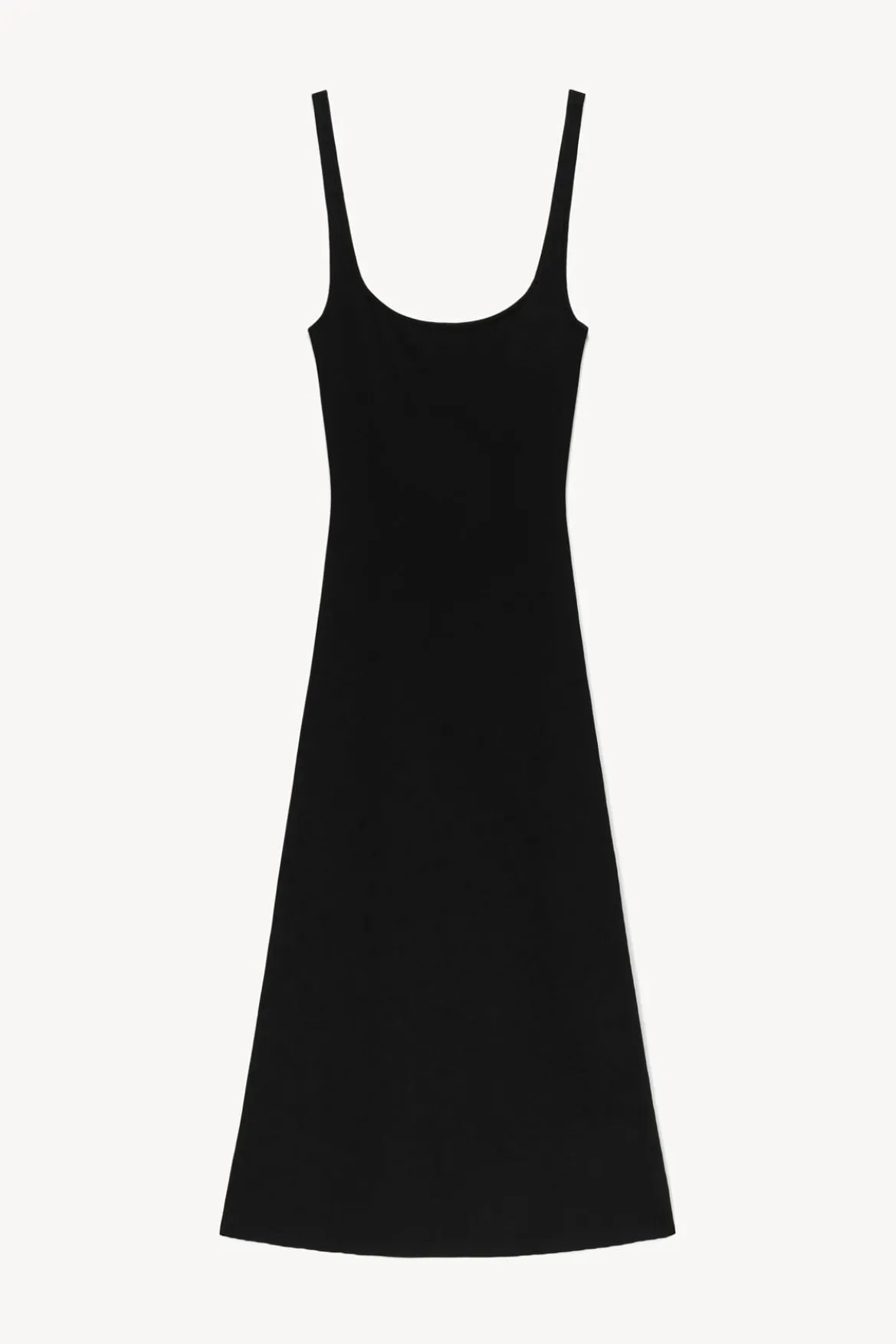 A fitted sleeveless dress made out of compact knit fabric. This style features a wide square neckline and midi length.