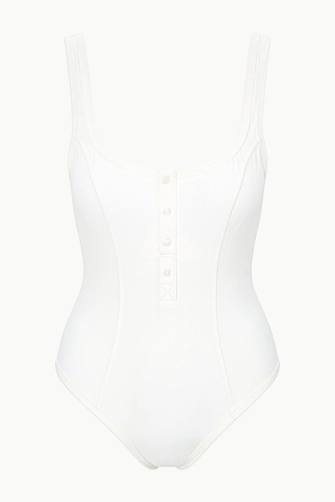 The Paula One Piece is a new swimsuit silhouette featuring a scoop neckline and faux button down detailing. This style has straps that offer moderate support.