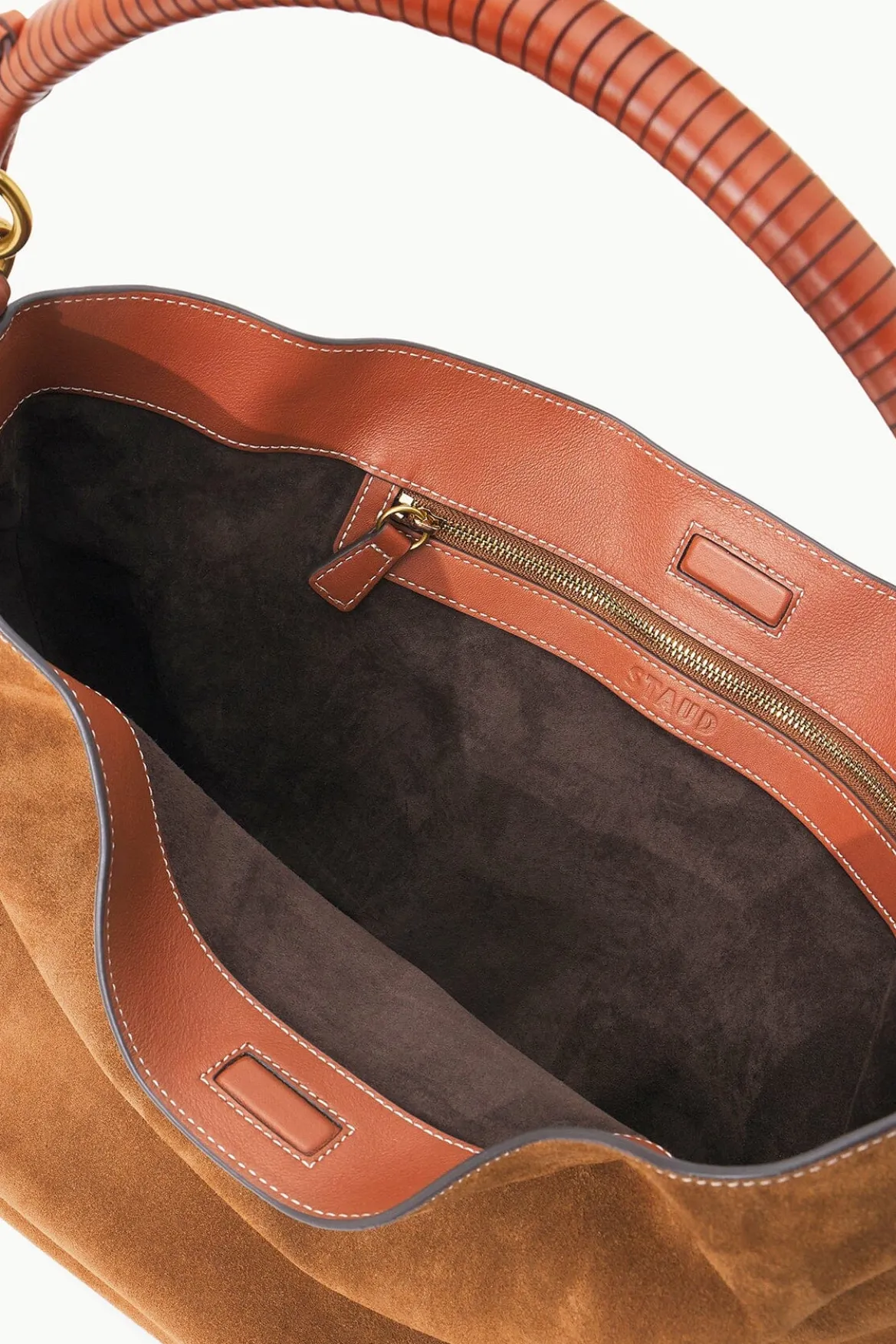 A slouchy suede hobo tote, the Perry Bag features a wrapped leather handle, metal hardware, a magnetic closure and suede lining.