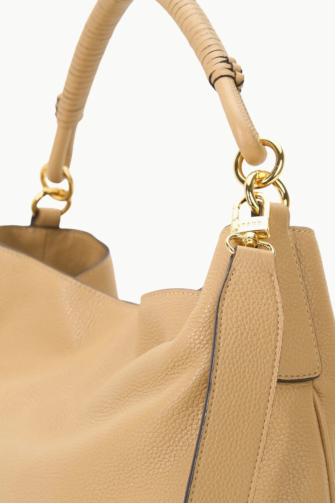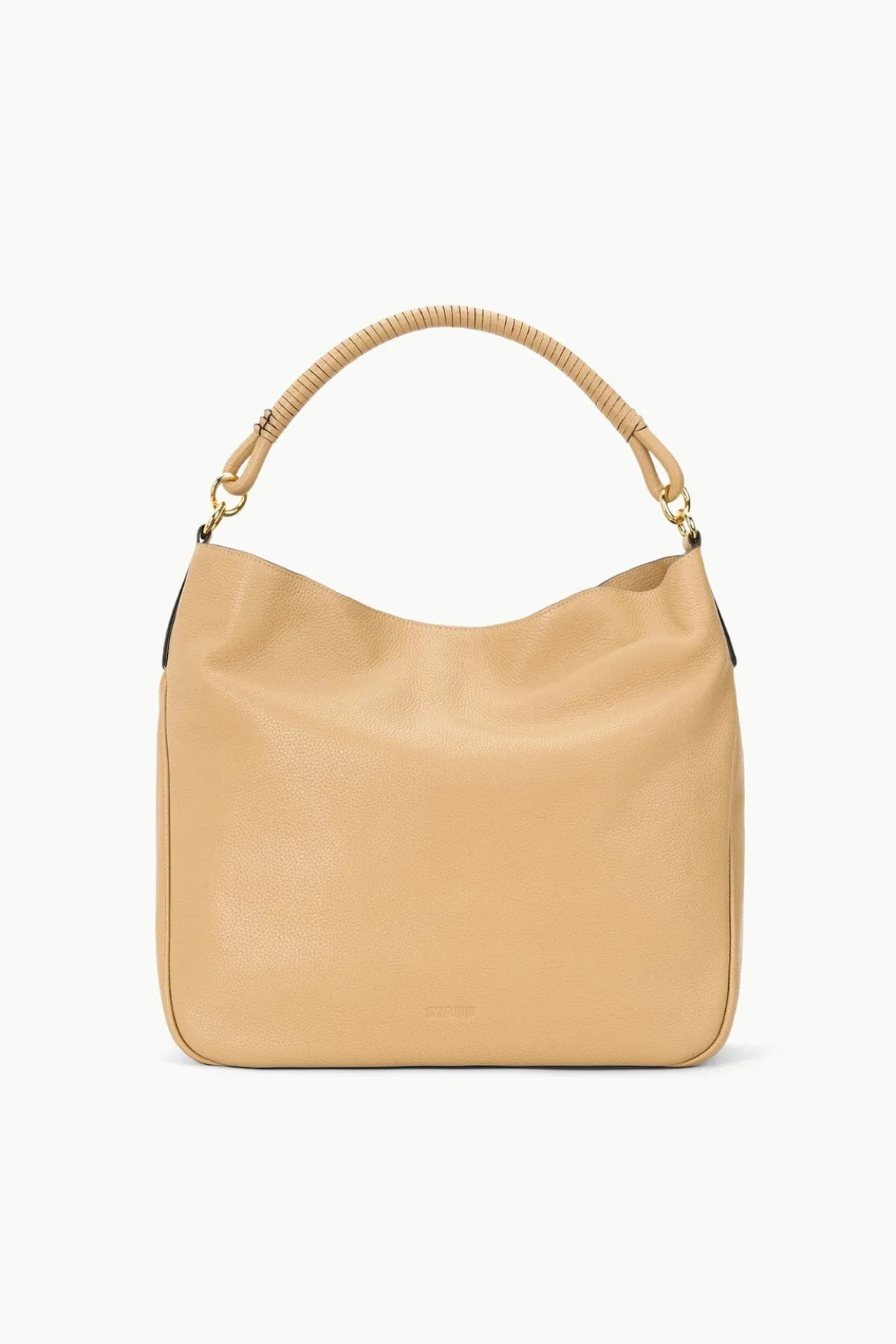 A slouchy pebbled leather hobo tote, the Perry Bag features a wrapped leather handle, a removable long shoulder strap, and a magnetic closure and suede lining.