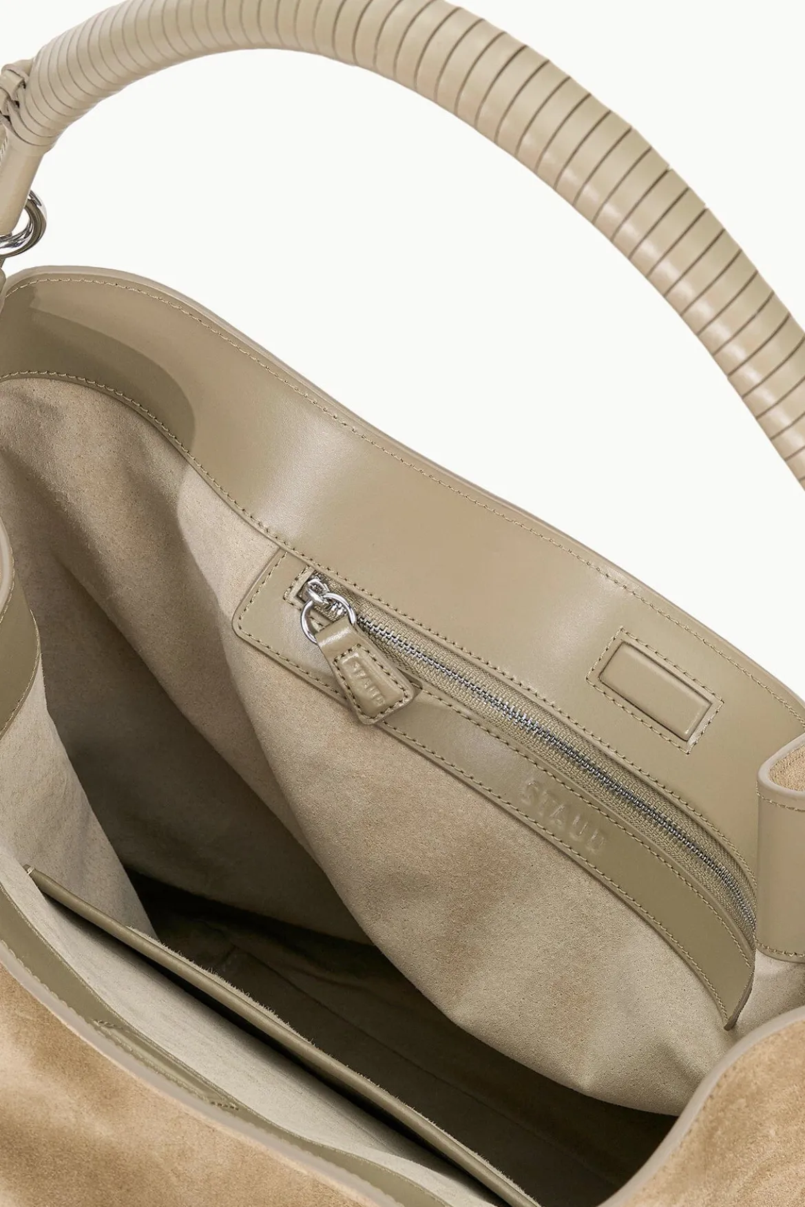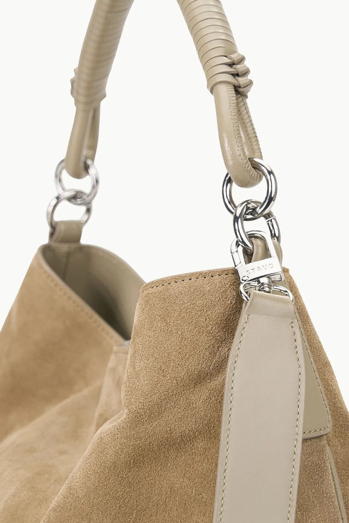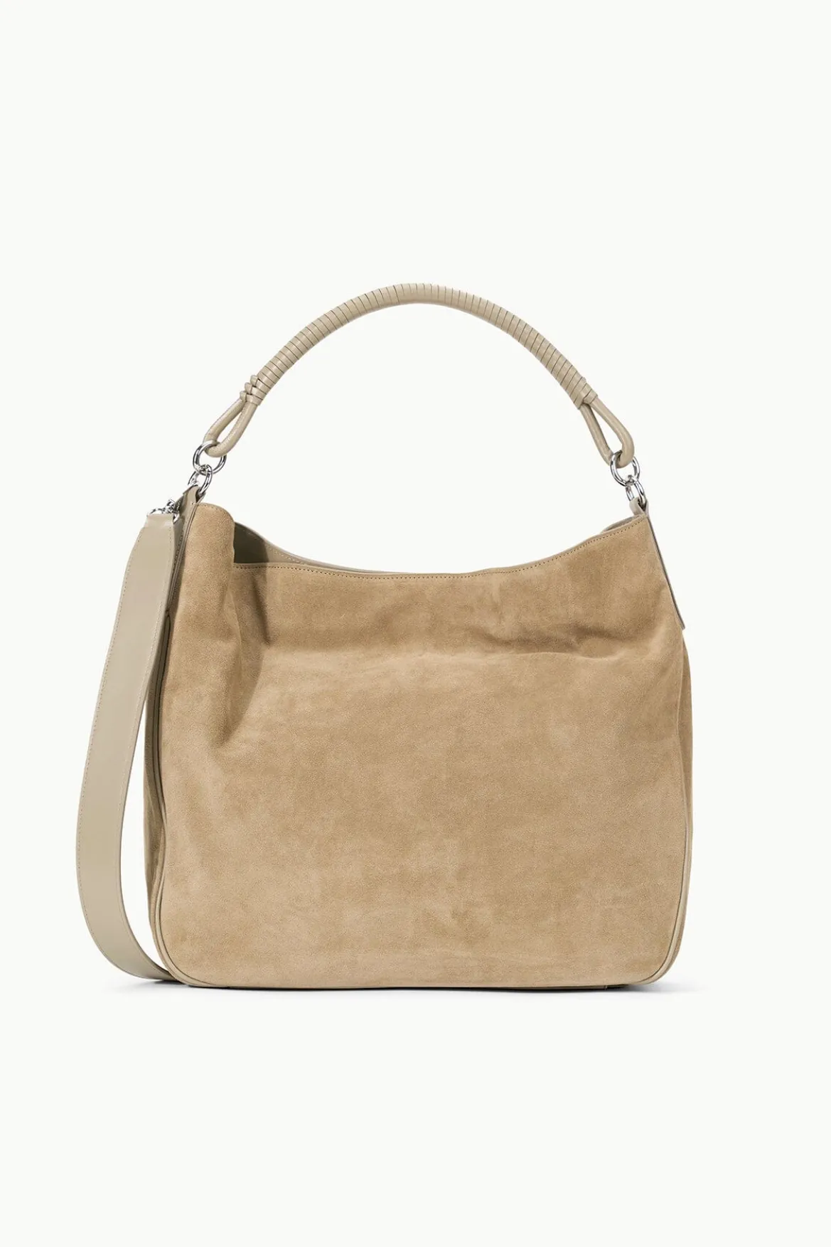 A slouchy suede hobo tote, the Perry Bag features a wrapped leather handle, metal hardware, a magnetic closure and suede lining.