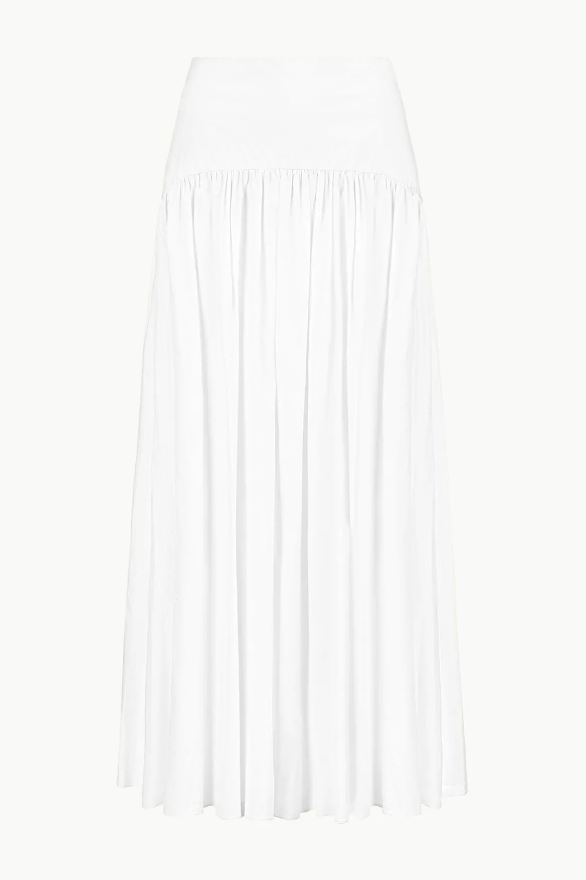 The Procida is a maxi skirt with a curved yoke at the hip and a hidden side seam zipper.