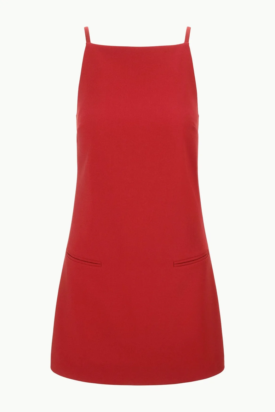 A tailored mini dress with relaxed silhouette, this style features double welt pocket details at the front and a square neckline.