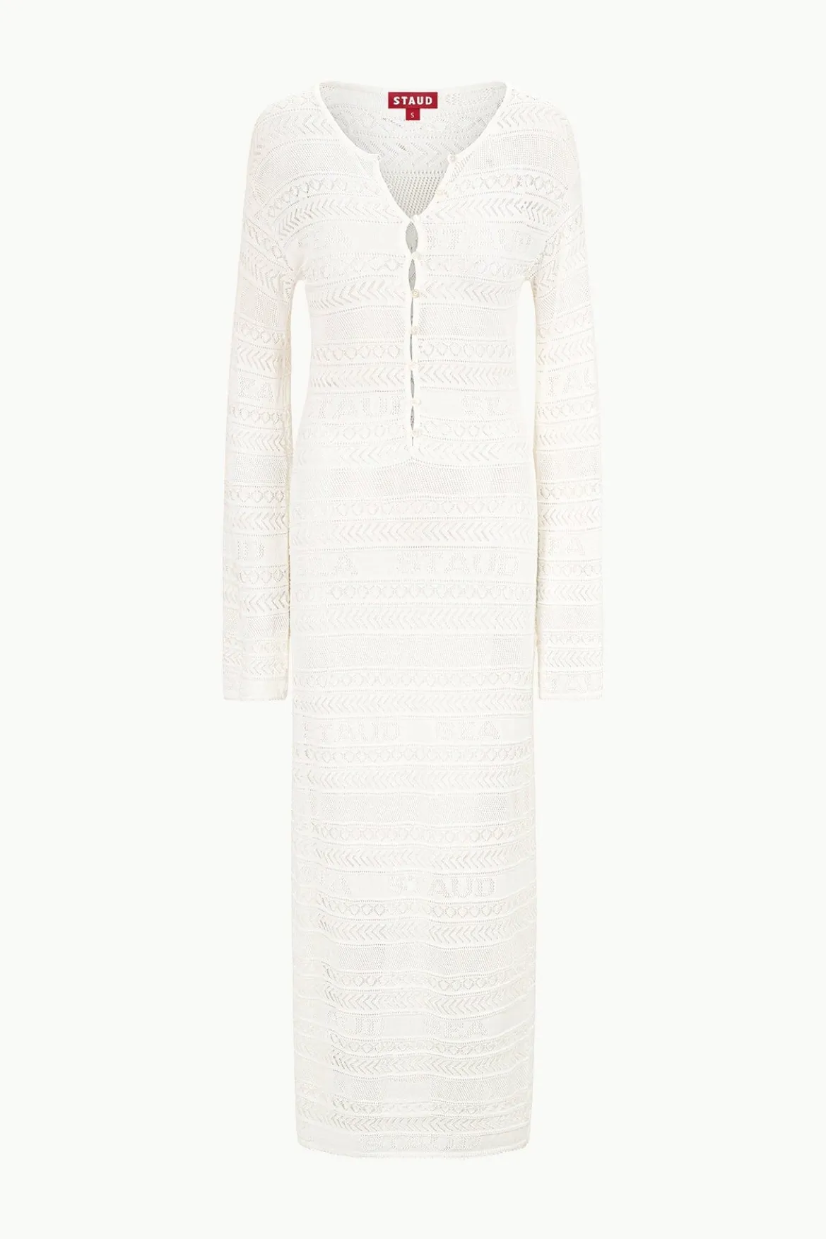 The Rosslare Cover-Up Dress is a sheer knit cover-up, featuring a slightly flared cuff, button detailing at the chest, and a side slit.