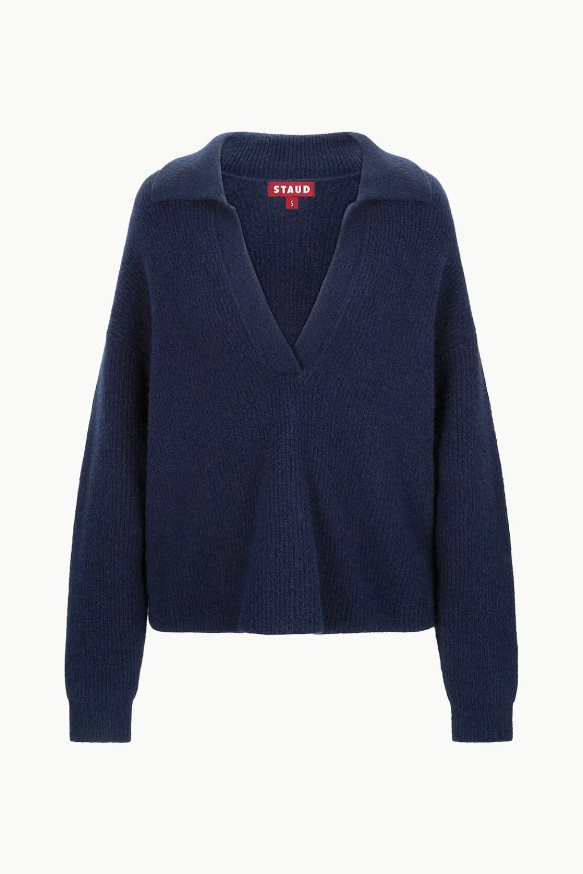 The Ruston is a relaxed fitting rib knit sweater with a polo collar and v neckline.
