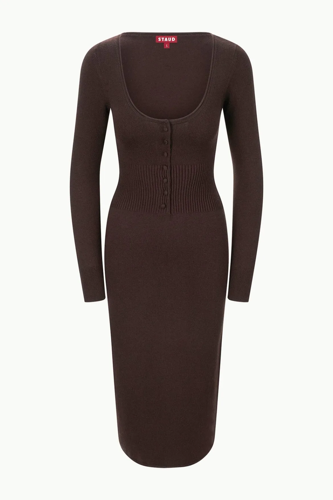 The Sabrina Dress is a fitted scoop neck sweater dress with a front button and ribbed waist detailing. This dress can be styled casually with flats or worn with boots and heels.