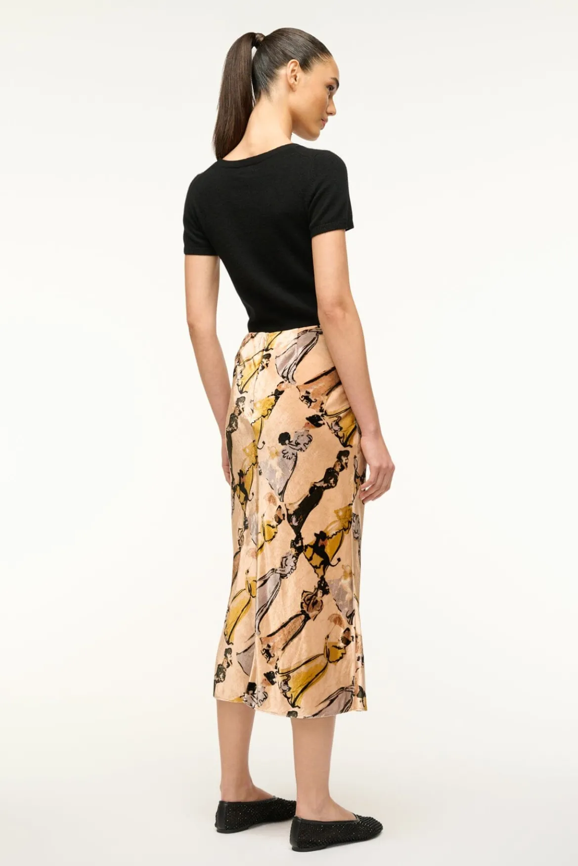 The Sadie Skirt is a midi length velvet skirt in a vintage-inspired print. It is cut on the bias to create a flattering silhouette.