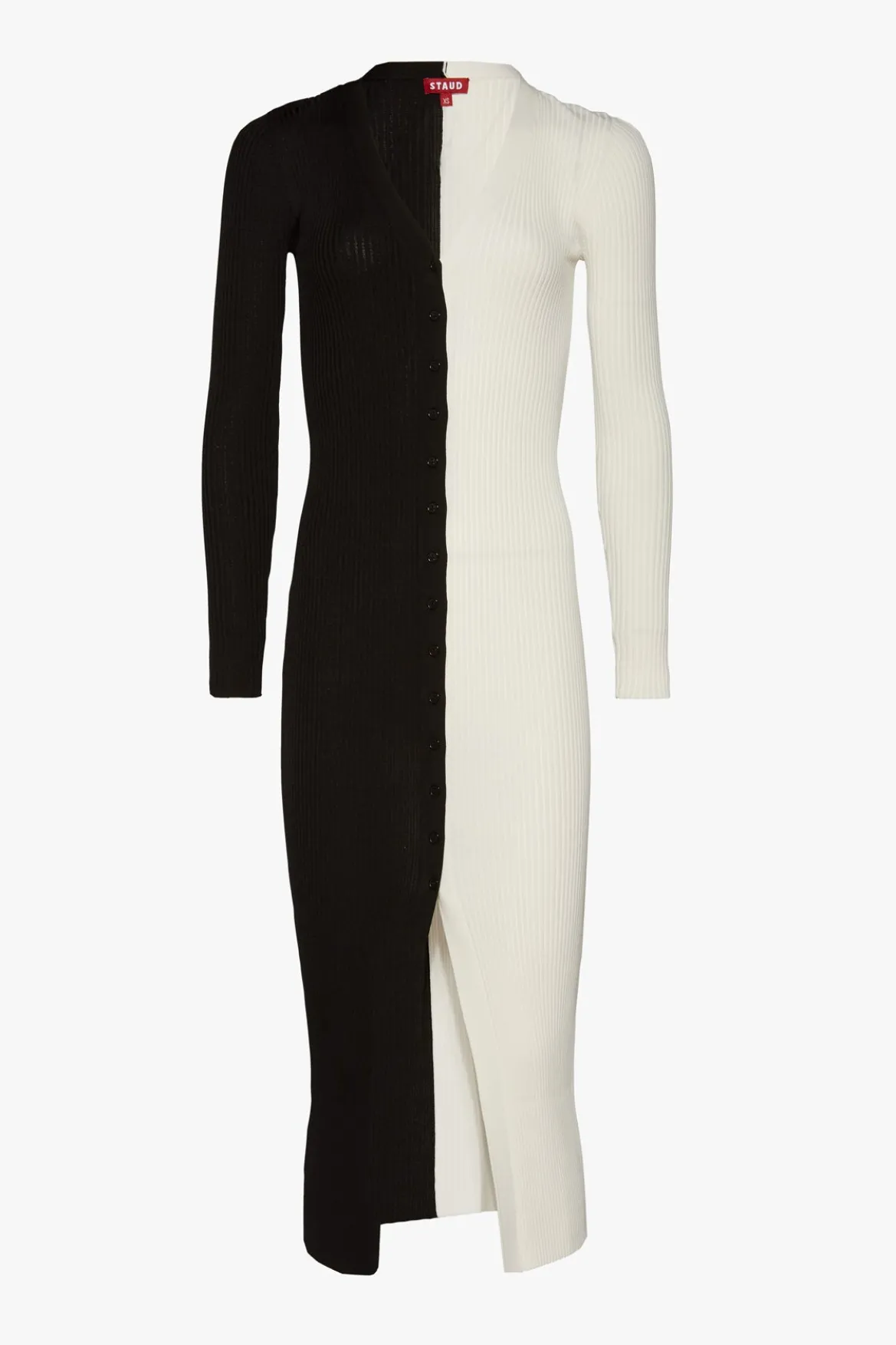 Our signature style, the Shoko Sweater, can be worn as a cardigan or dress. Thistwo-tone styleis made out of stretchy, comfortable compact rib knit fabric.